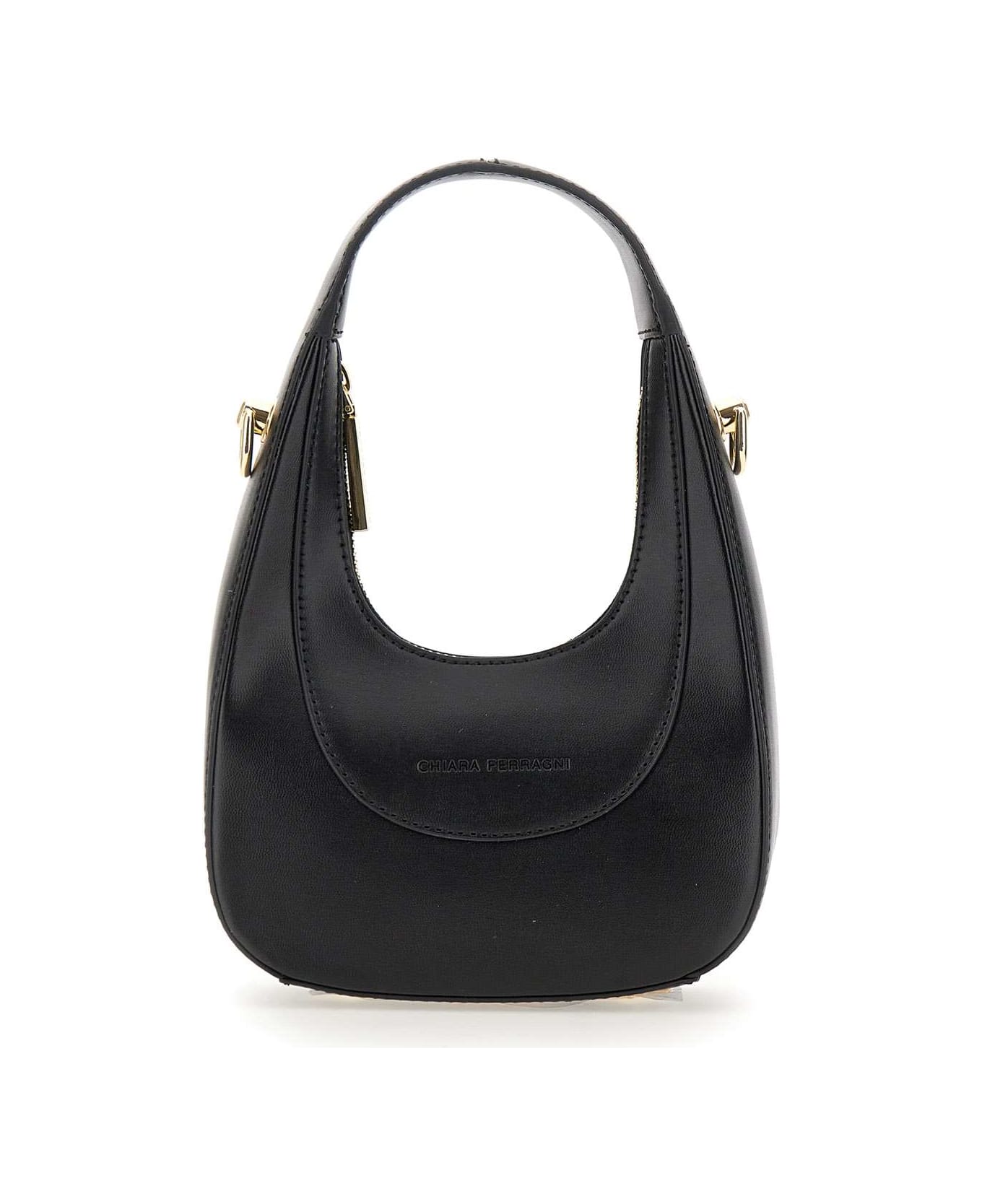Chiara Ferragni "Caia" eco-leather handbag, black colour, central closure with zip, front logo, top handle, metal studs at hem Eye Star, shiny gold hardware, internal slot pocket, removable and adjustable shoulder strap 90cm. Measurements: length 16cm, height from handle 24cm, depth 6cm.