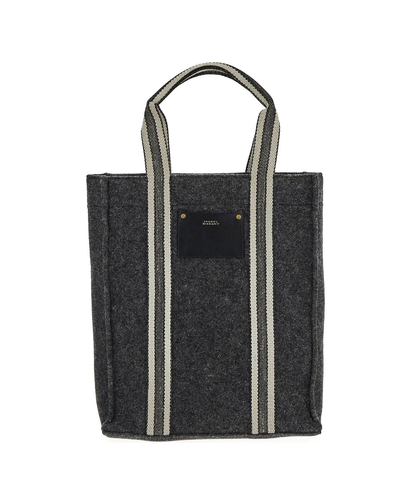 Isabel Marant tote bag in dark grey felted wool blend with grosgrain striped straps extended to the bottom, front leather patch pocket with gold-finish logo print, reinforced twin top handles and wide compartment.