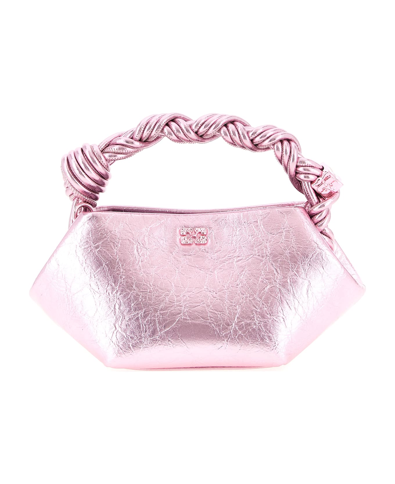 Bou' mini handbag in craquelé metallic leather-effect fabric, tone-on-tone metallic 'Ganni Butterfly' logo on the front, inner magnetic closure, fixed braided handle with tone-on-tone metal knot and nut, adjustable and removable shoulder strap, and back embossed logo. SUSTAINABLE: product made from recycled materials.