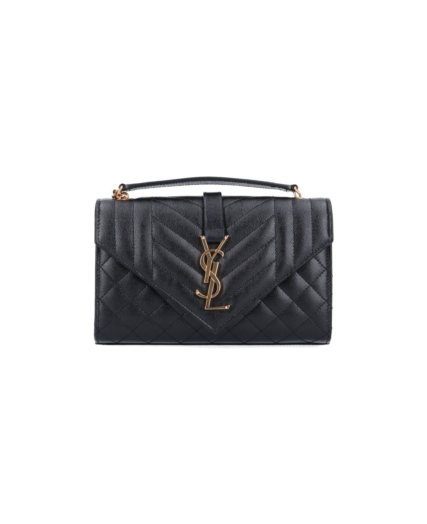 Saint Laurent 'Envelope' Shoulder Bag, embossed and quilted leather, black colour, adjustable chain shoulder strap, magnetic closure, golden metal logo on front.