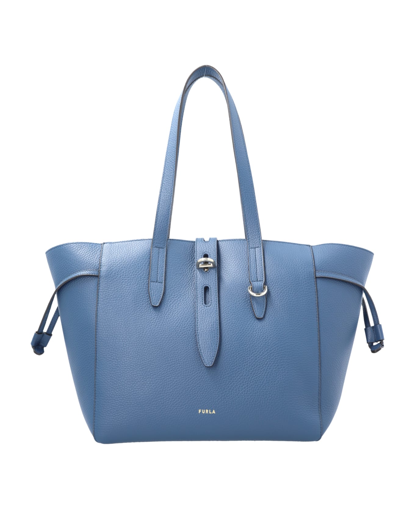 Furla Net M' grained leather shoulder bag with long handles, tie closure with lacing, perforated holes on the front, front lettering logo, side drawstring, d ring on the side for charms and small pockets and a zip inner pocket.
