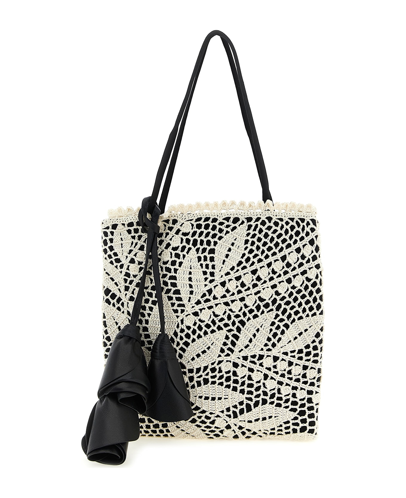 Julia' satin handbag with contrasting crochet knit top level, side gussets, double fixed handle, leather pendant. Composition: 51% cotton, 49% silk