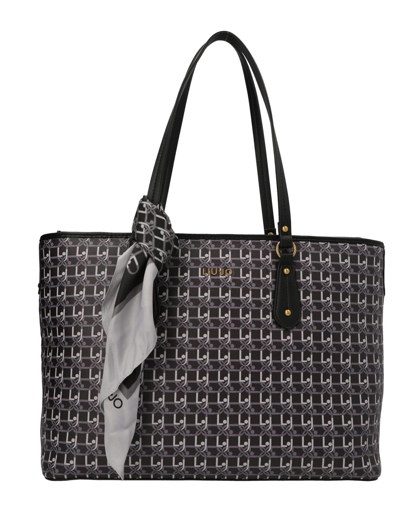 'L' in polyurethane shopping bag with all-over chain logo print, front metal logo, a matching scarf, double handle, contrast lining, an inner logo label and a zip closure.