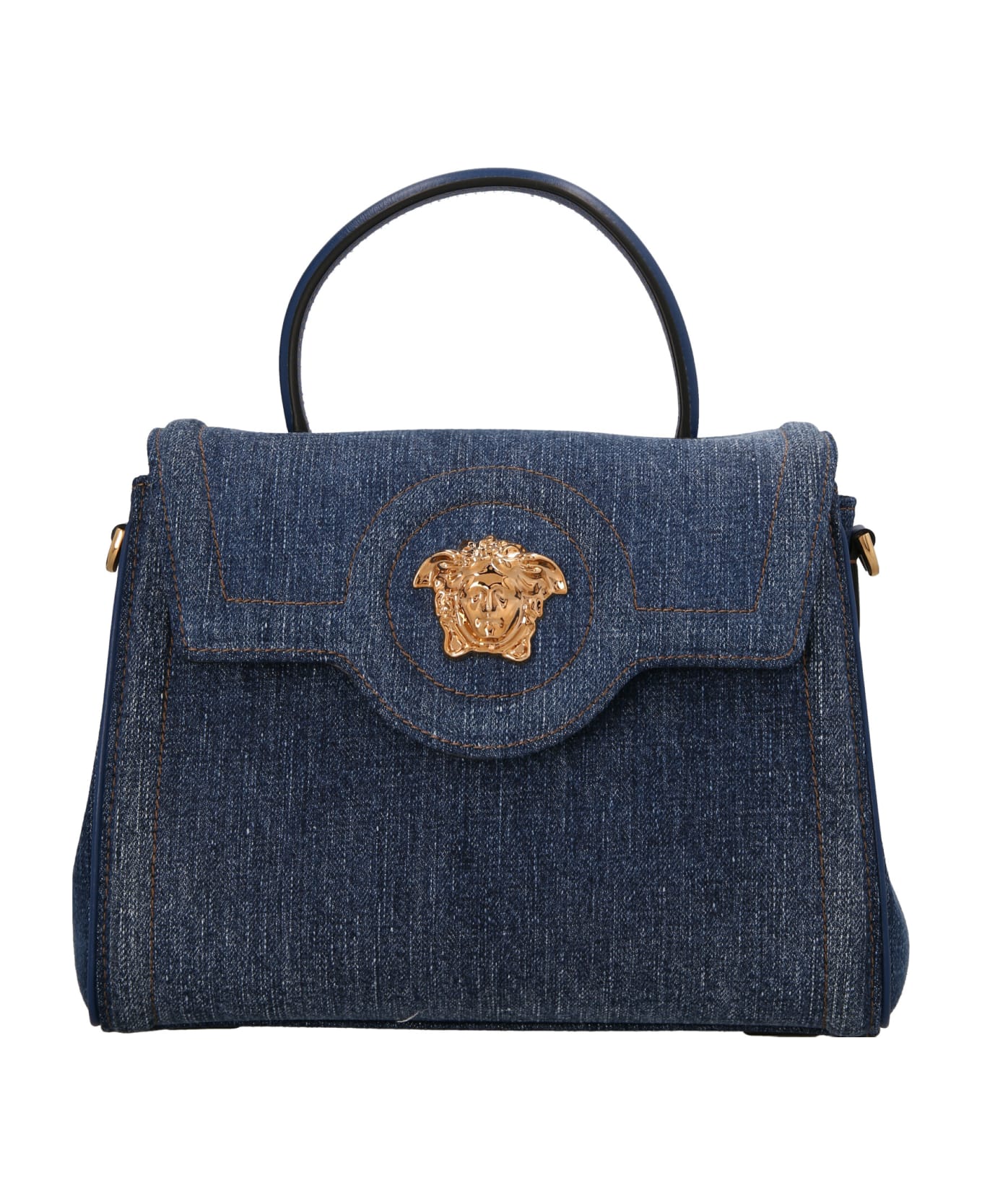 Denim handbag with front 'Medusa' appliqué, a magnetic closure, a handle, with adjustable and removable shoulder strap. Composition: