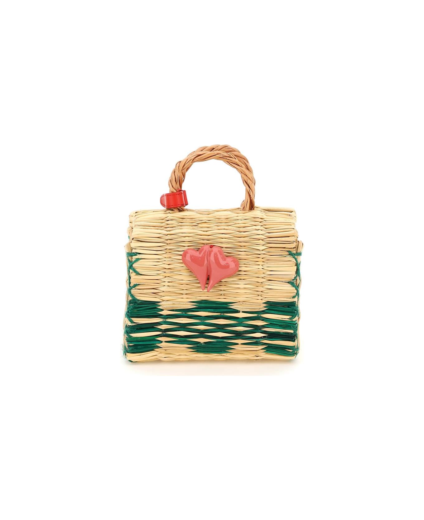 Mini CHACHA bag by HEIMAT ATLANTICA crafted in hand-woven reed and enriched with porcelain double hearts charm applied on front. Reed top handles connected with a leather strap with press-stud, unlined interior with leather base, gold-finished metal protective feet.