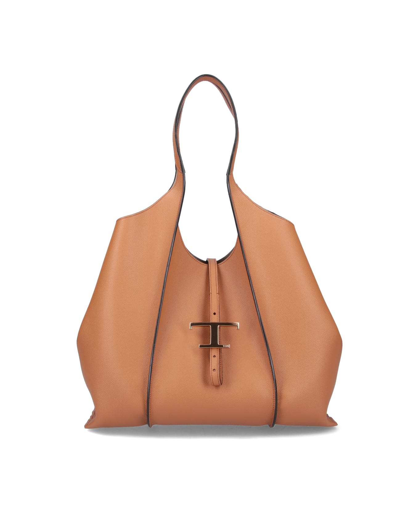 Tod's T-timeless tote bag in brown hammered leather with two top handles, strap closure with gold metallic logo detail, removable interior pouch, and main interior compartment. Composition: 100% Leather