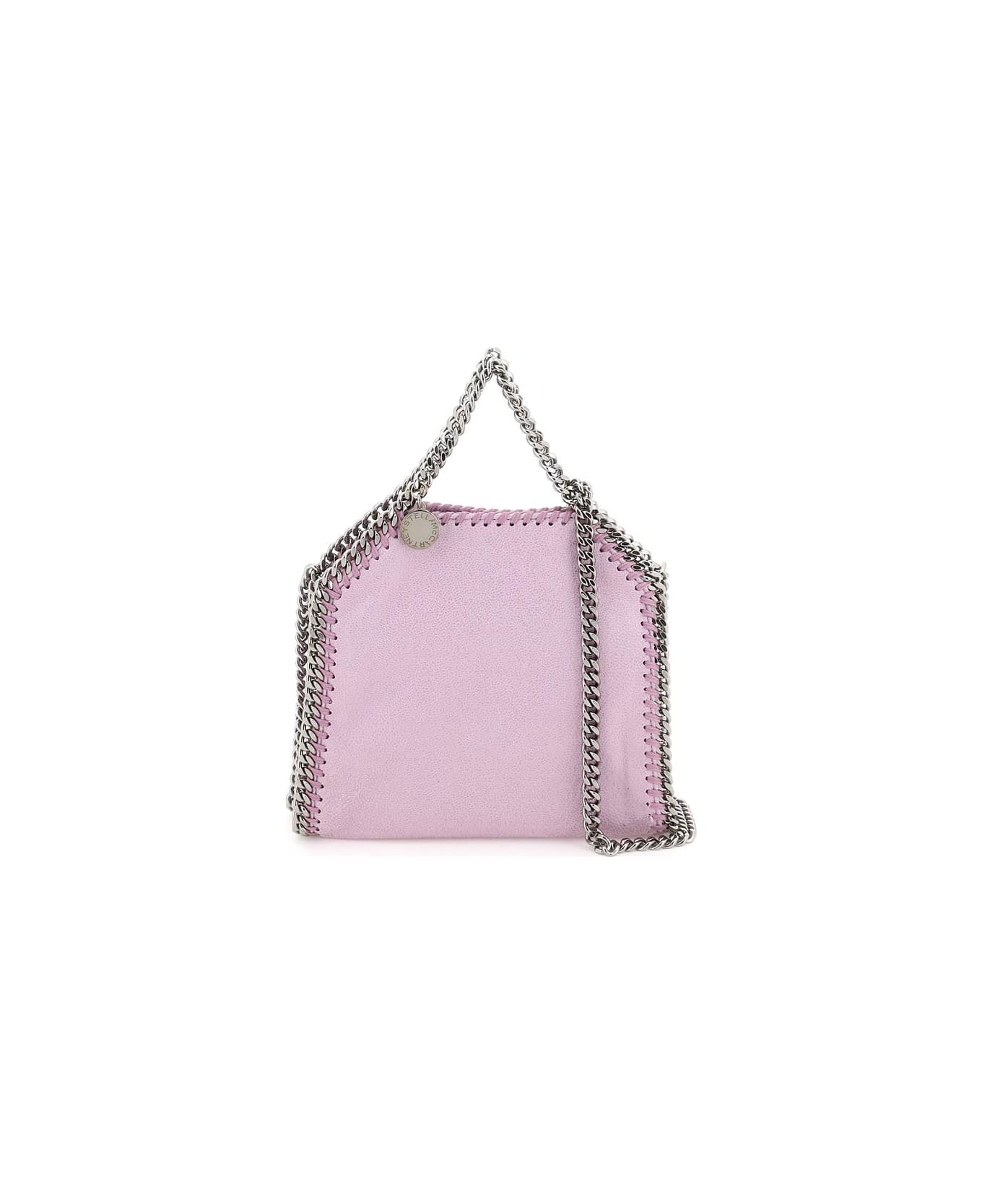 Faux leather Tiny Falabella bag by Stella McCartney with chain double handle and strap, inside snap closure, chain on hemlines and logo charm. Nylon logo interior lining, inside patch pocket and ruthenium-finish metal hardware.