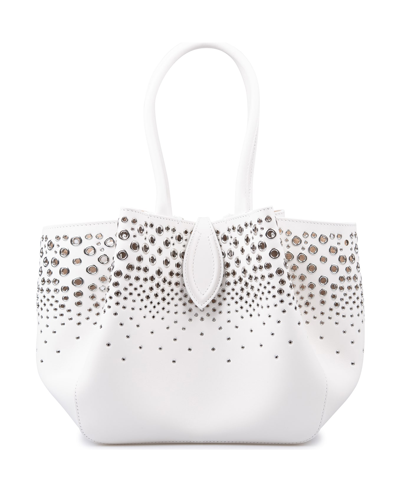 Angele 25 bag by Alaia made of white leather and decorated on the upper part with silver-plated brass eyelets applied with a degrade' effect. Model characterized by two handles, single internal compartment, "ogive" closure and a detachable leather clutch. The bag can be carried by hand or on the shoulder.