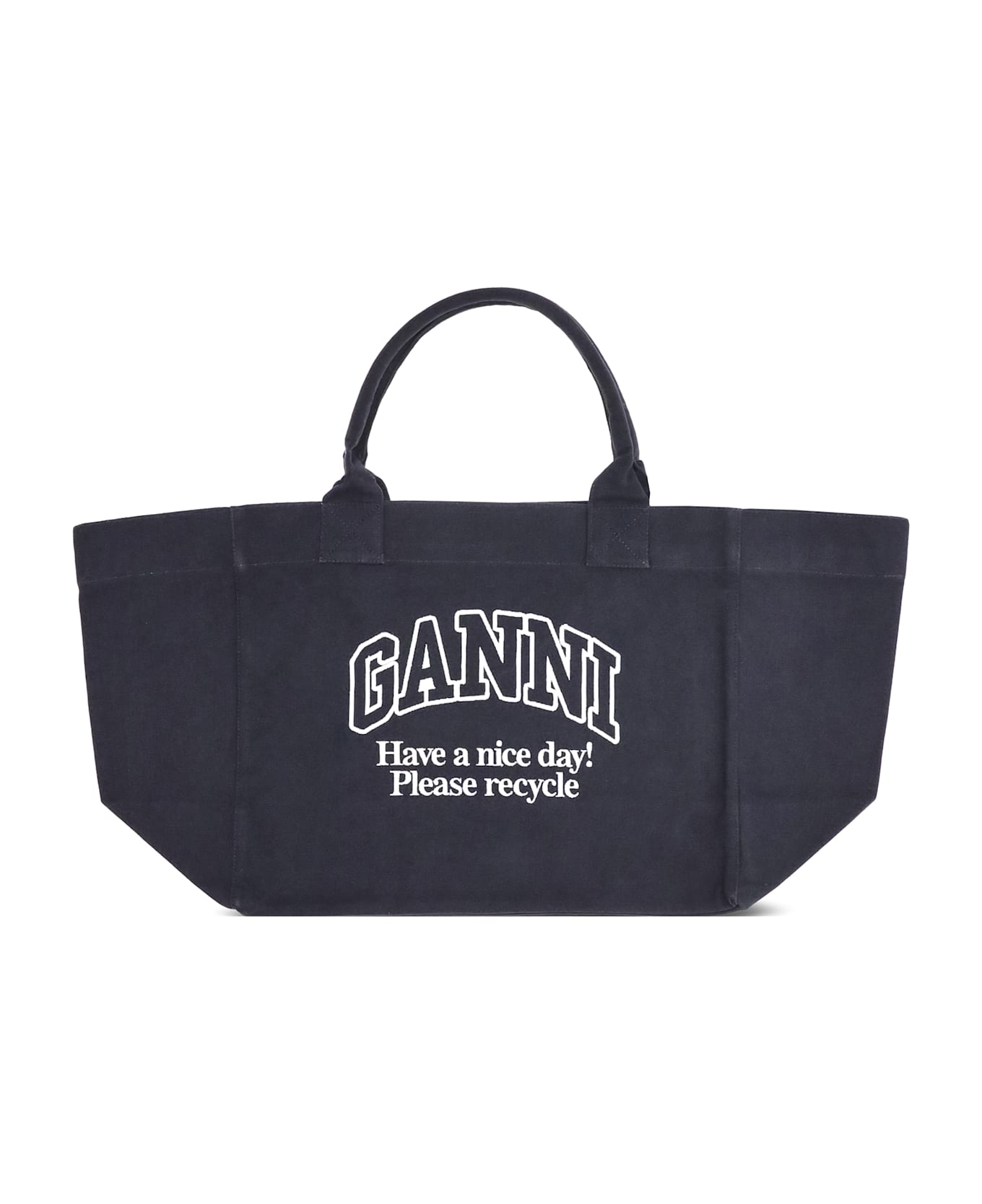 Ganni's xxl canvas tote bag features sturdy top handles and a large interior compartment. the design is embellished with the ganni logo accompanied by the phrase "have a nice day! please recycle! " printed in white, an eco-friendly and characterful touch. Composition: 100% % Recycled Cotton