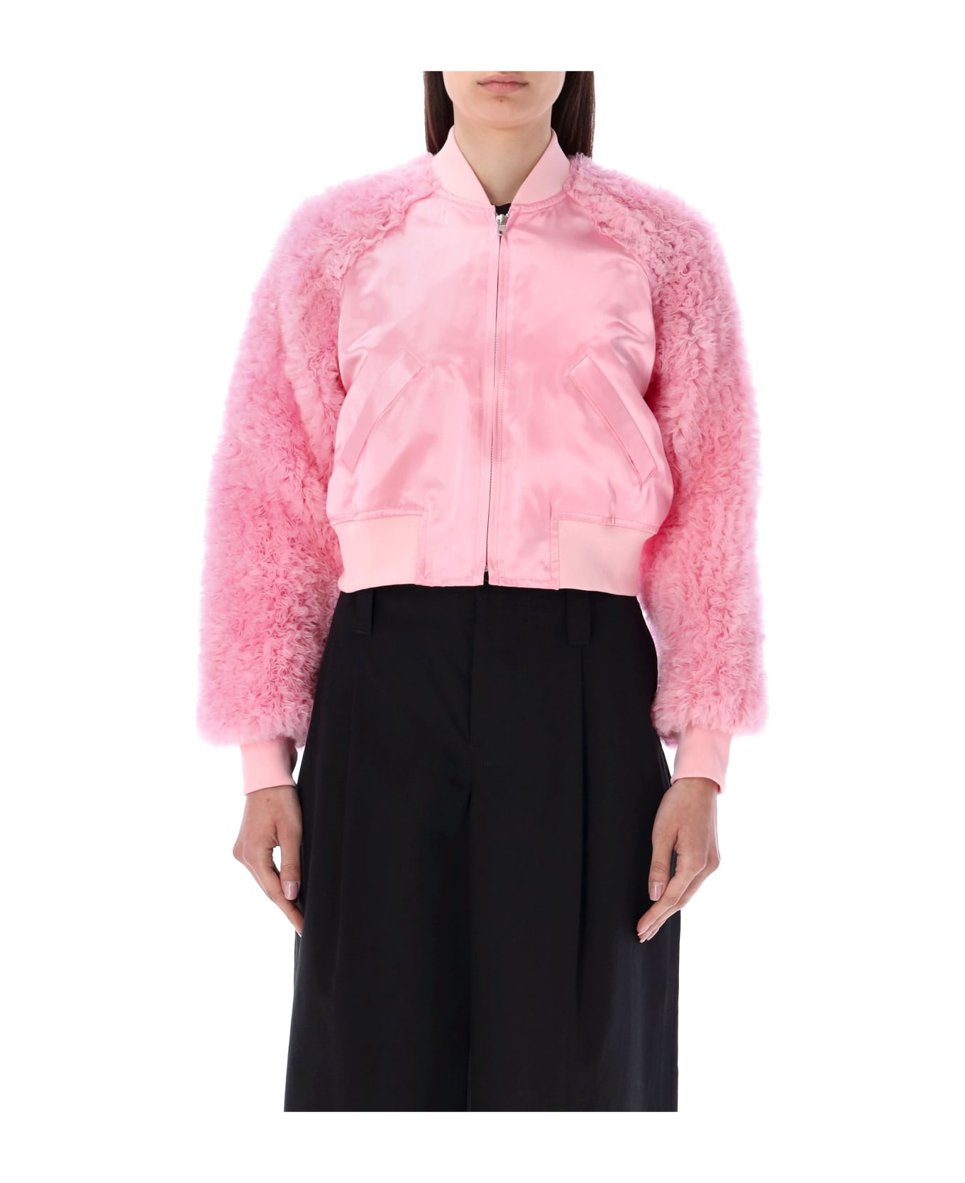 Satin Cropped Bomber Jacket By Comme Des Garçons Girl. Featuring: Classic Ribbed Collar Front Zip Fastening Ruffled Tulle Sleeves Side Pockets Rib Trims Cropped Length The Model Is 1,72 M Tall And She's Wearing Size S