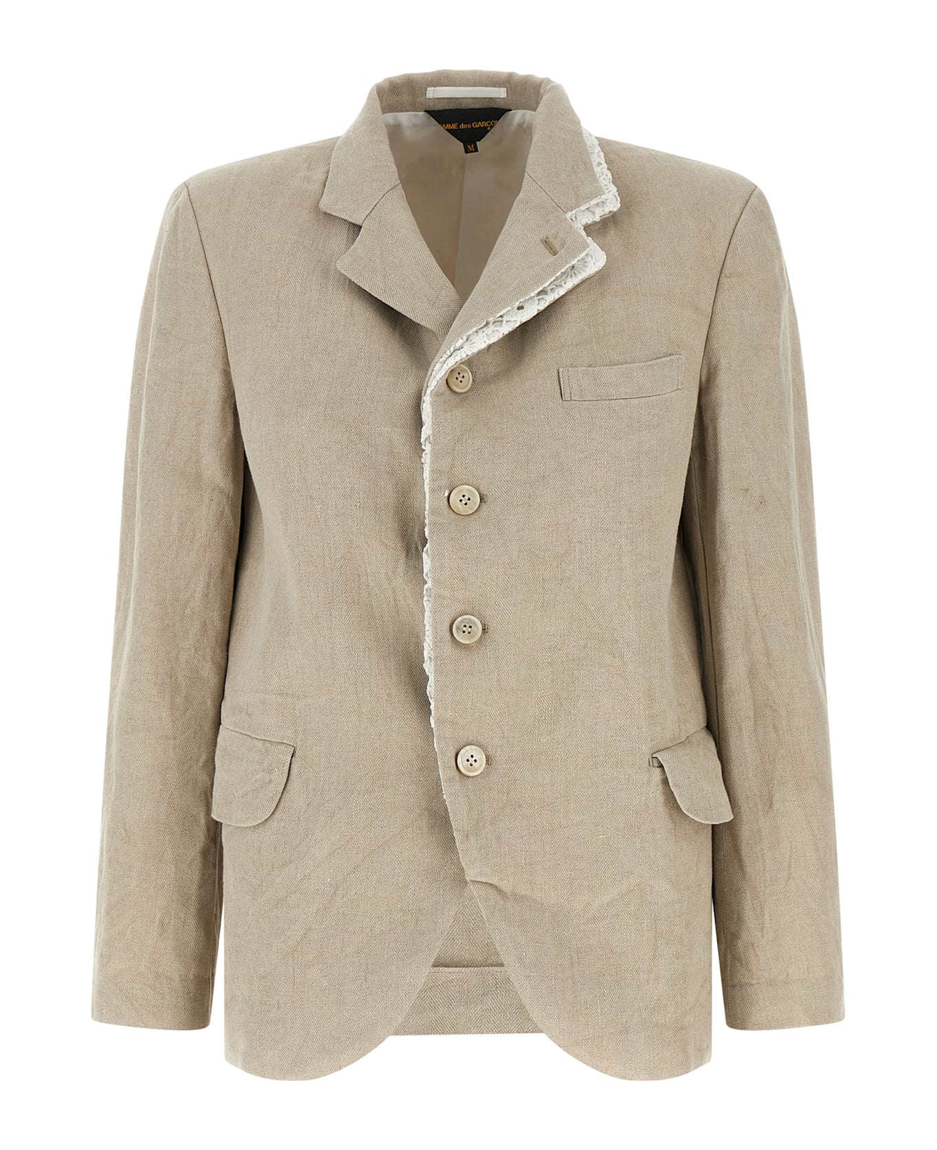 Chevron linen blazer with double layer lapel on the left side with cotton insert with tone-on-tone crochet embroidery, single-breasted model with front button closure, breast pocket, flap pockets, structured shoulder strap, long sleeves, asymmetrical hem, cotton half-lining.