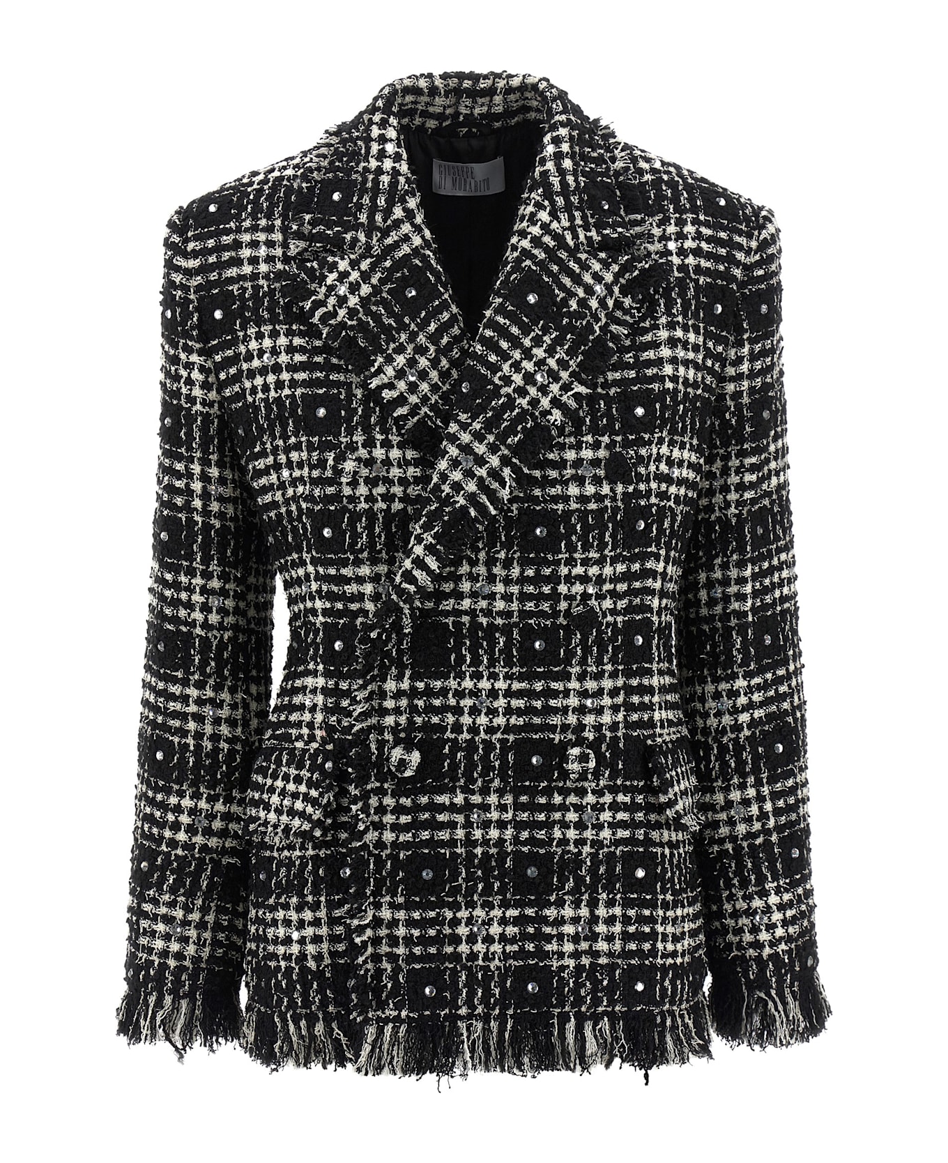 Double-breasted wool blend tweed blazer with peak lapel neckline, all-over rhinestone appliqué, front pockets, frayed effect on the edges.