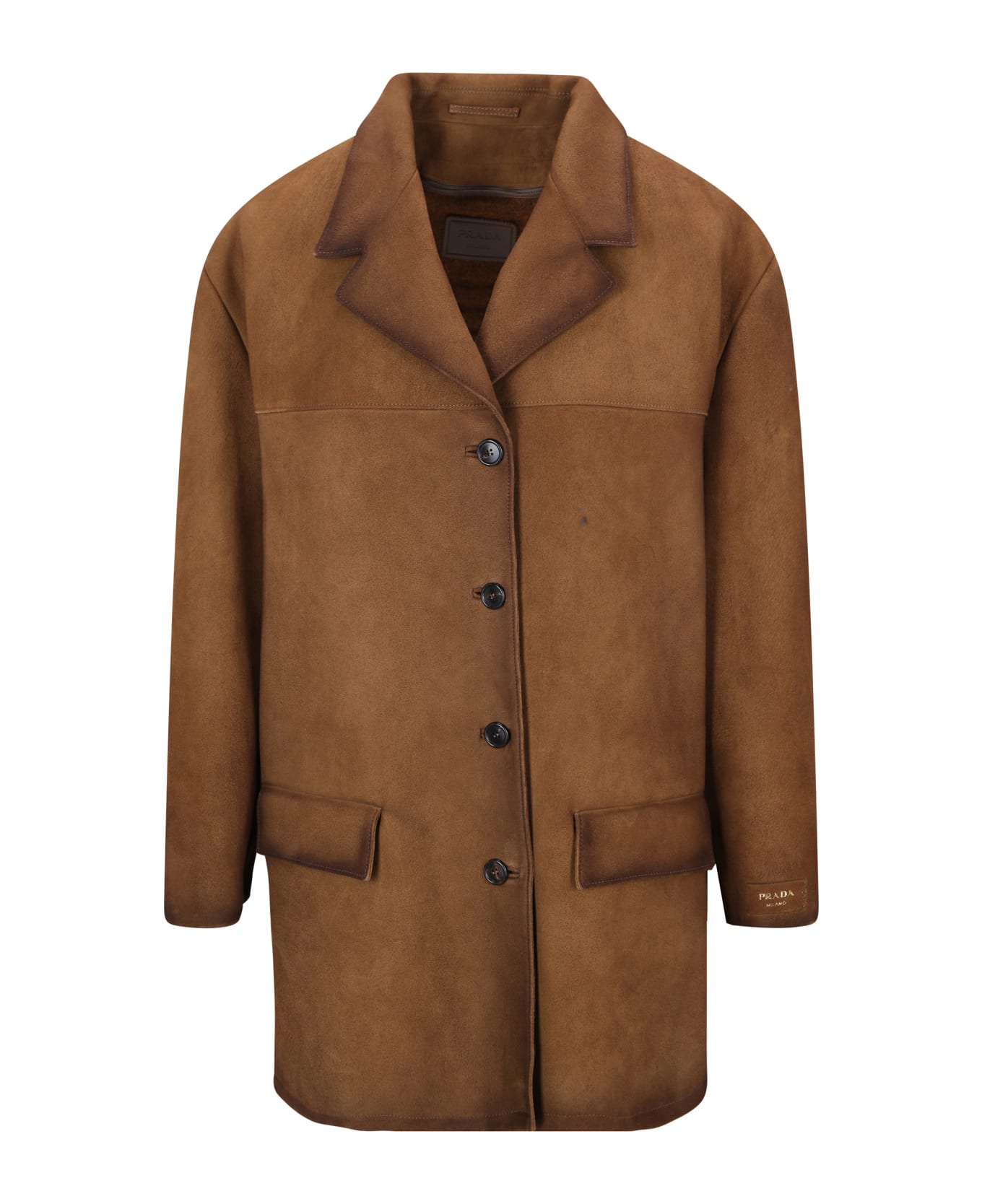 Lambskin coat by prada, classic collar, a contrasting front button fastening, a vintage-effect suede design, two side welt pockets with a flap for closure, and a regular fit. Composition: 100% % Lamb Ovis Aries Aries