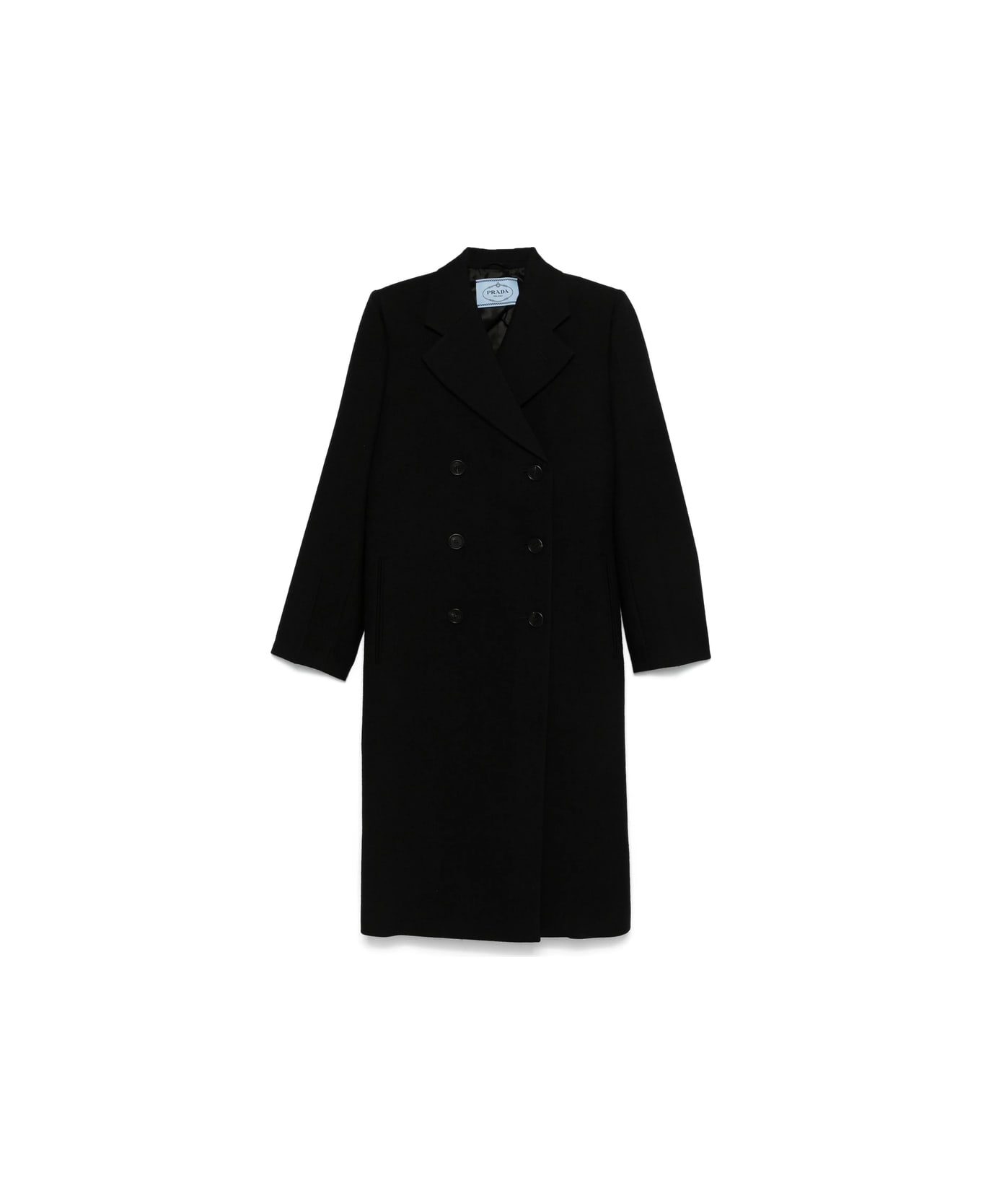 black virgin wool textured finish panelled design double-breasted button fastening notched lapels shoulder pads long sleeves two front jetted pockets satin panelling adjustable strap to the rear central rear vent asymmetric hem mid-length