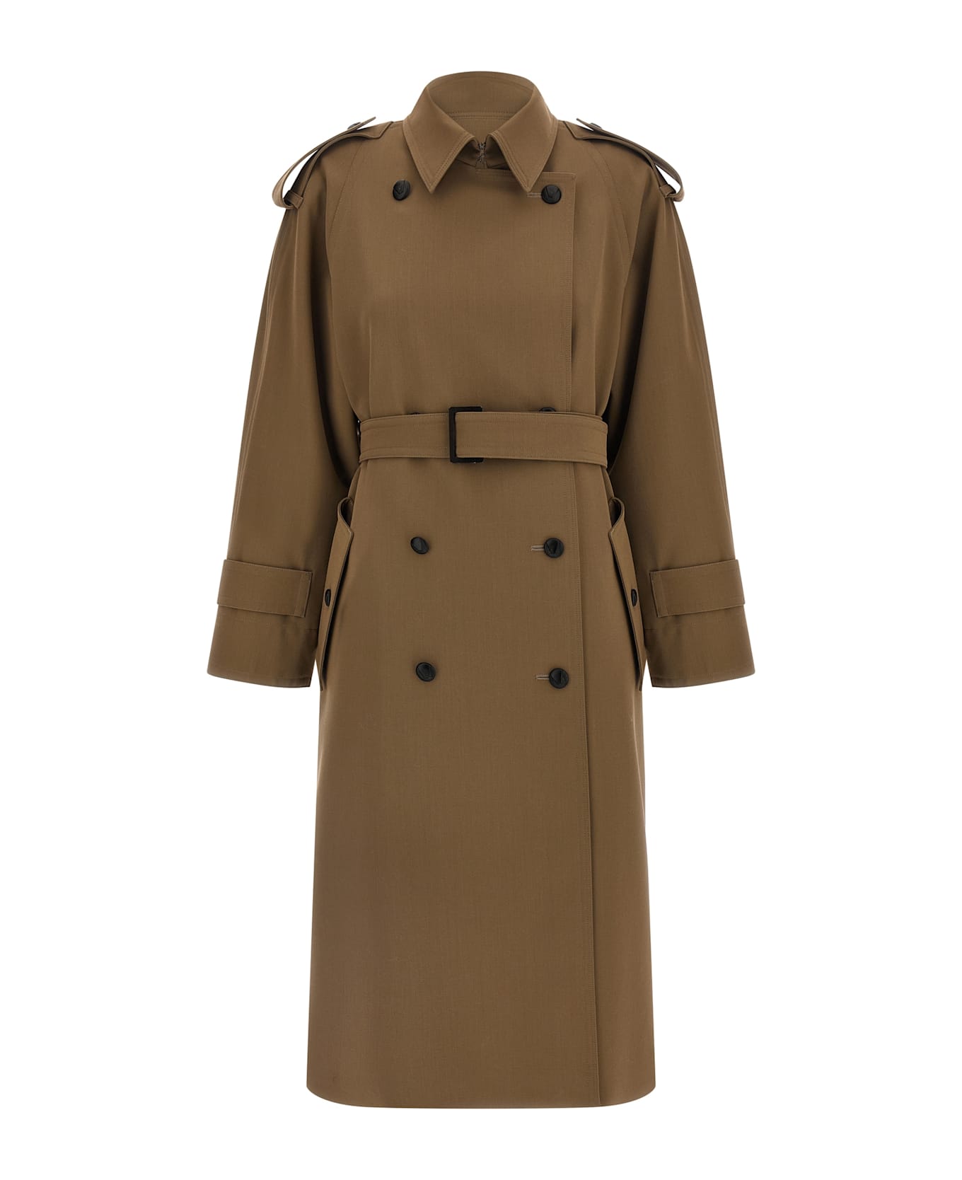 'Mxmcerto' wool gabardine waterproof trench coat with shirt collar, double-breasted button closure, back cape, flared cut with wide back split, removable and adjustable belt with buckle, side pockets with flap and buttons, straps on the shoulders, long sleeves with straps on the cuffs with buttons.