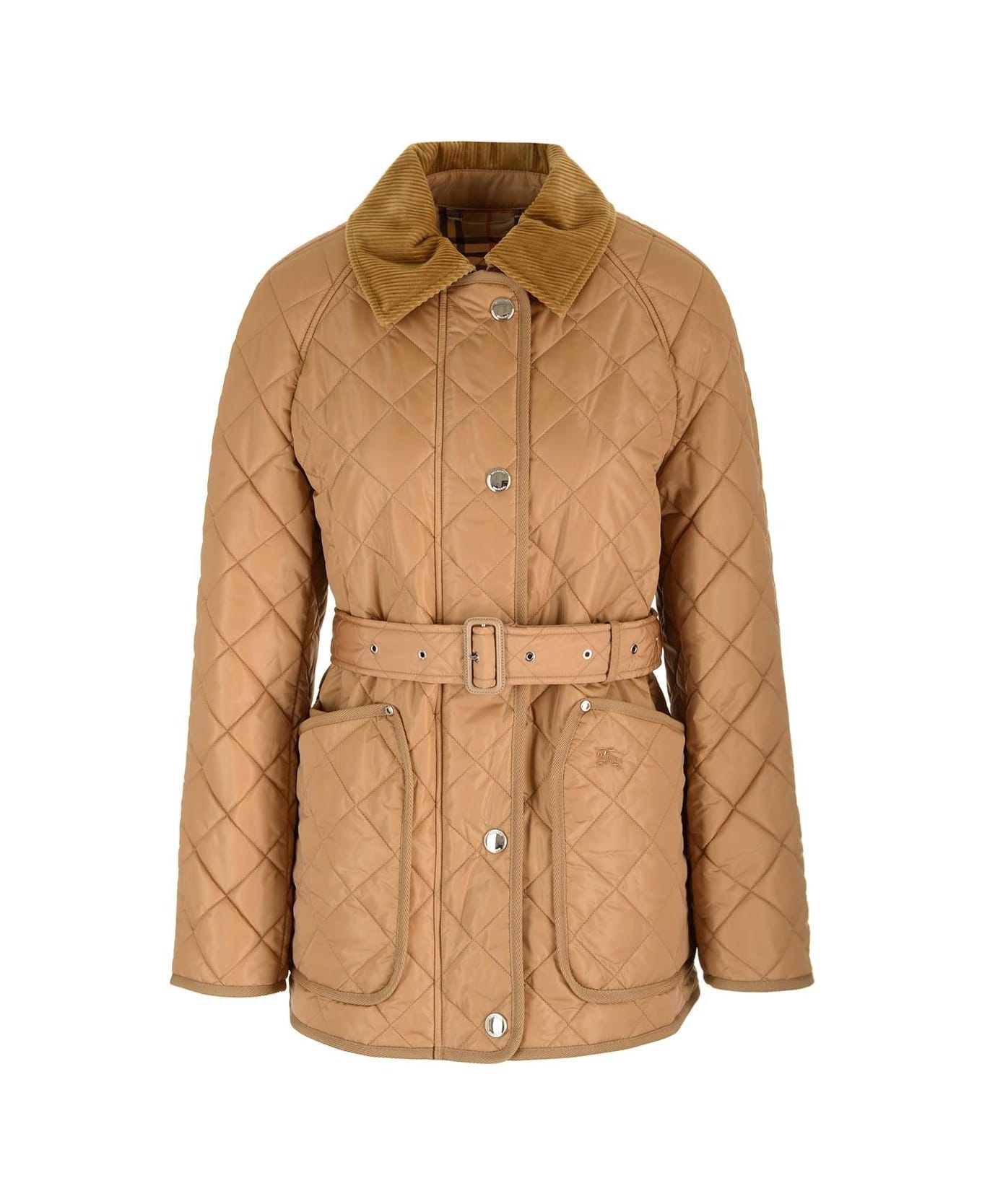 "Penston" quilted jacket from Burberry with corduroy collar and Burberry Check interior. Regular fit, belt with buckles, zip and press-stud closure, side patch pockets, cuffs with press-studs, side vents with press-studs. Composition: 100%POLYAMIDE