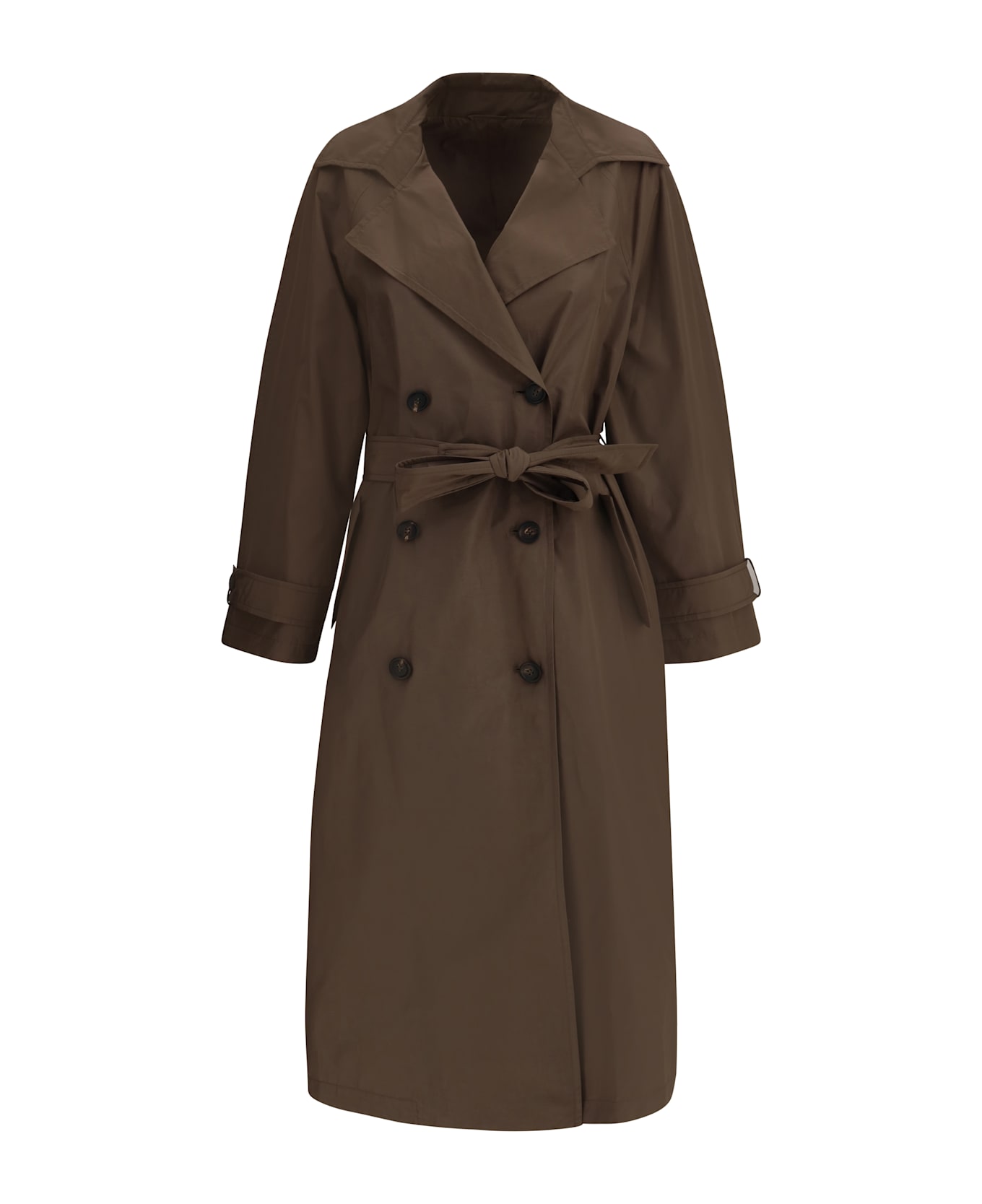 The trench coat with monili decoration by brunello cucinelli is a sophisticated and sophisticated garment, offered in a refined chocolate hue. made in a double-breasted model with button closure and waist belt, it is embellished with the iconic monili beaded decoration that adds light and character. completing the design are two side flap pockets and a unlined construction, enhancing its lightness and natural elegance.