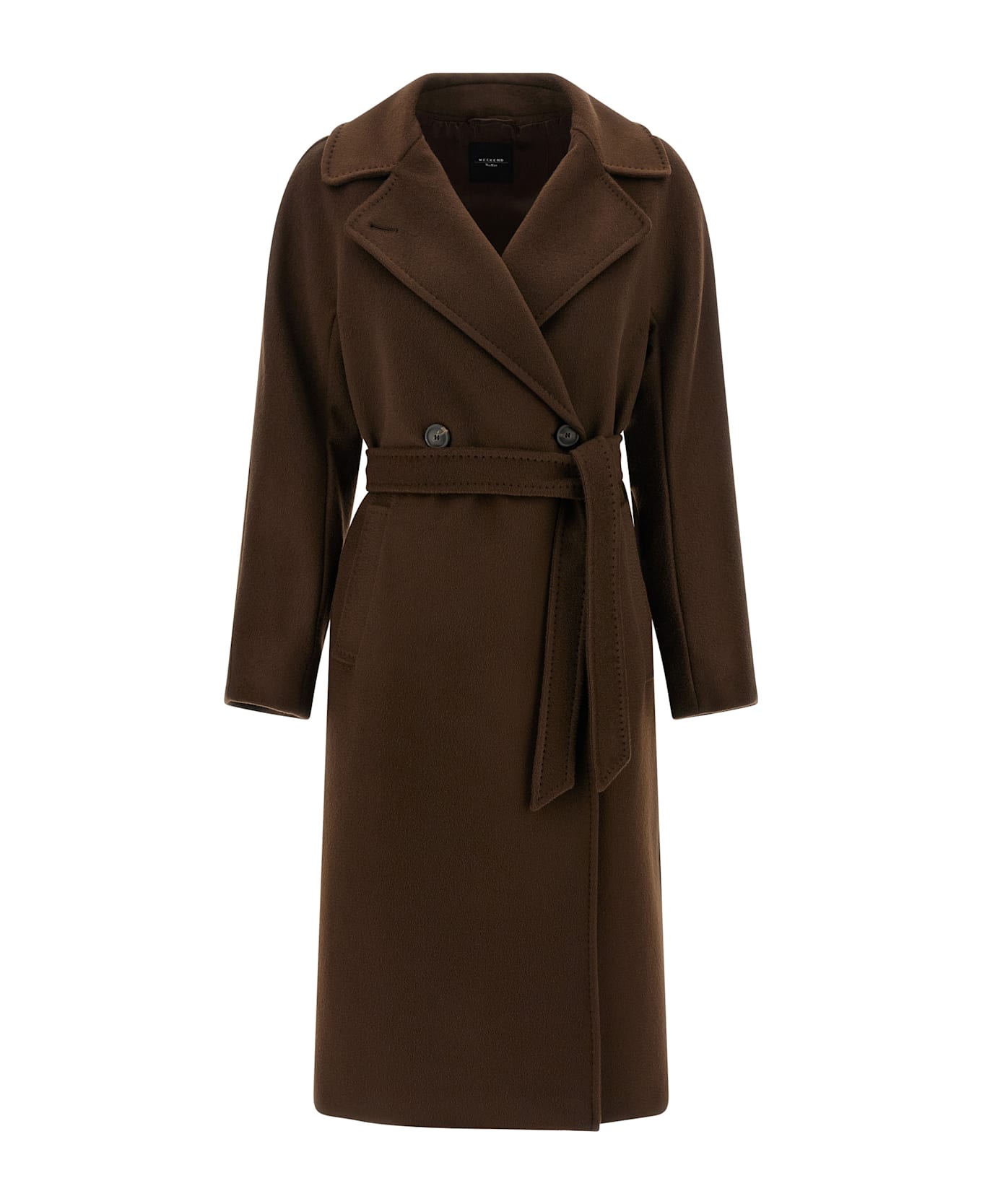 'Resina' double-breasted V-neck wool coat with wide lapels, button closure, side pockets, back central split, knotted belt at the waist, long and wide sleeves, Composition: 100% virgin wool