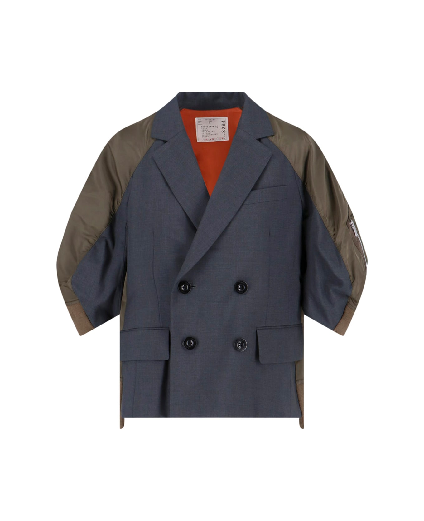 Sacai double-breasted jacket in gray fabric with peak lapels, double-breasted button closure on the front, three-quarter sleeves, two front flap pockets, zip pocket on the sleeve, straight hem.