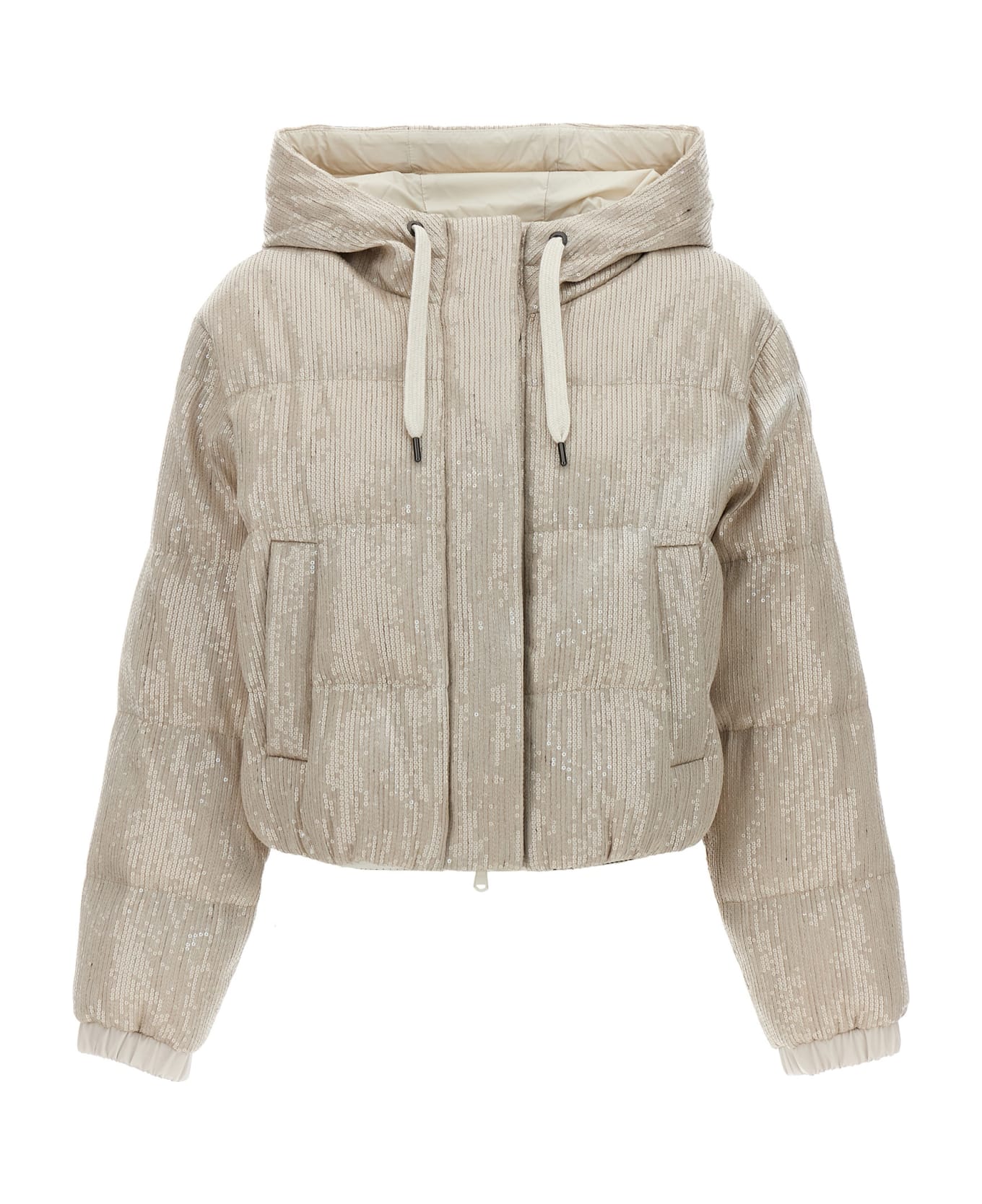 Silk blend down jacket with all-over sequins, down padding, hood, zip and button closure, pockets, long sleeves with elastic cuffs. Composition: 80% acetate, 20% silk