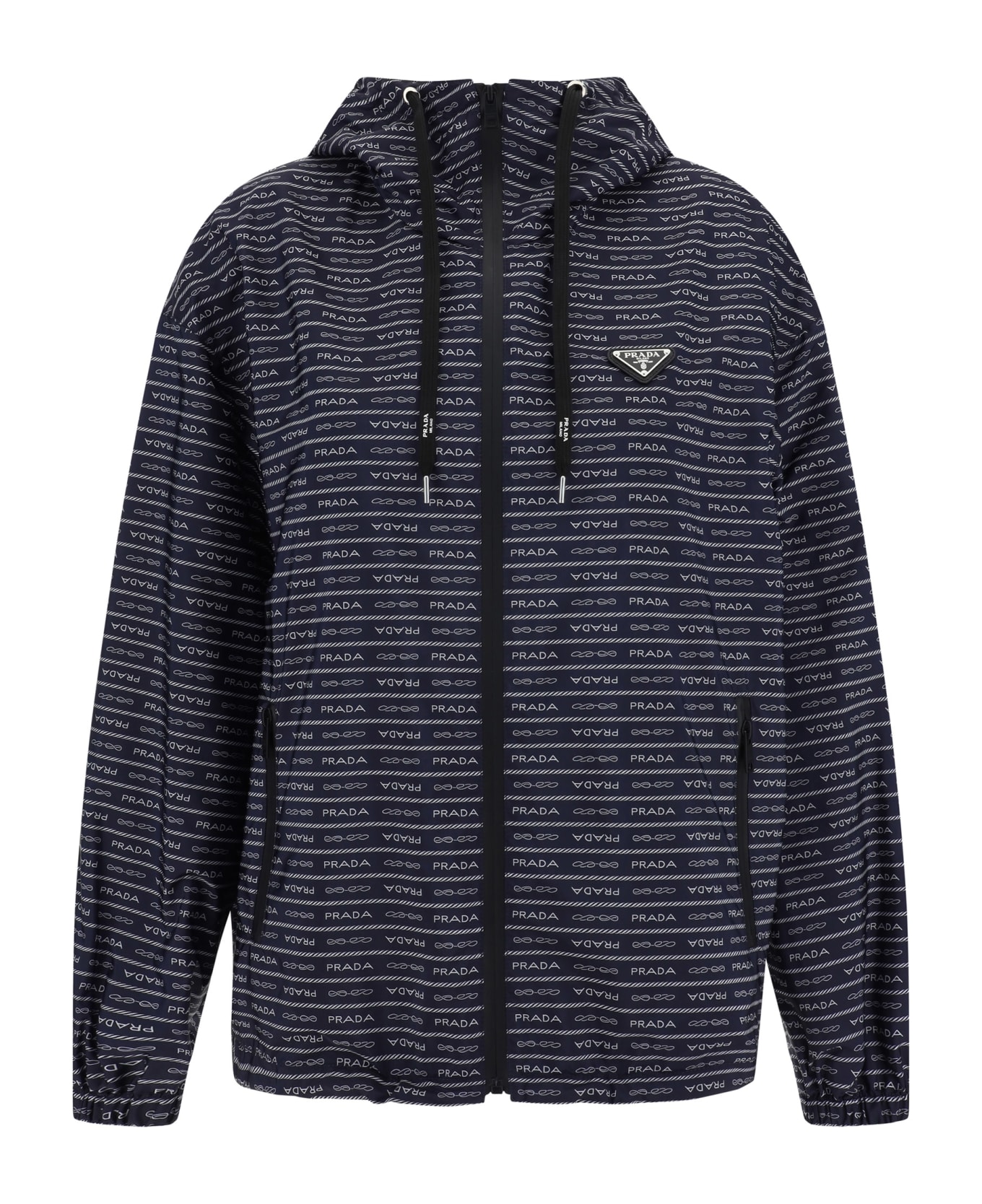 Windbreaker jacket by prada, hood with drawstring, iconic triangular enamelled brand signature plaque applied to the front, front zip fastening, iconic all-over printed and repeated brand monogram, elasticated cuffs. Composition: 100% % Polyamide