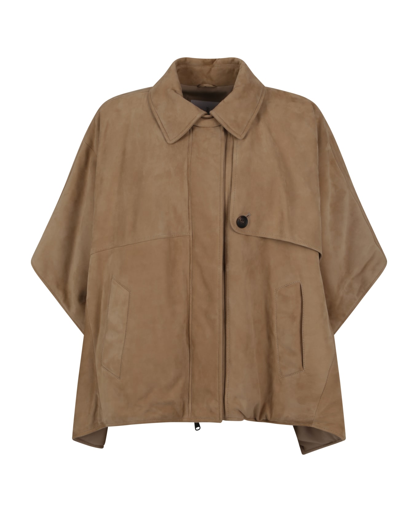 Calfskin poncho by brunello cucinelli, all-over suede and padded design, classic collar, front closure by concealed zipper and snap buttons, adjustable side panels by button, wind flap on front, two side welt pockets, overzise fit.