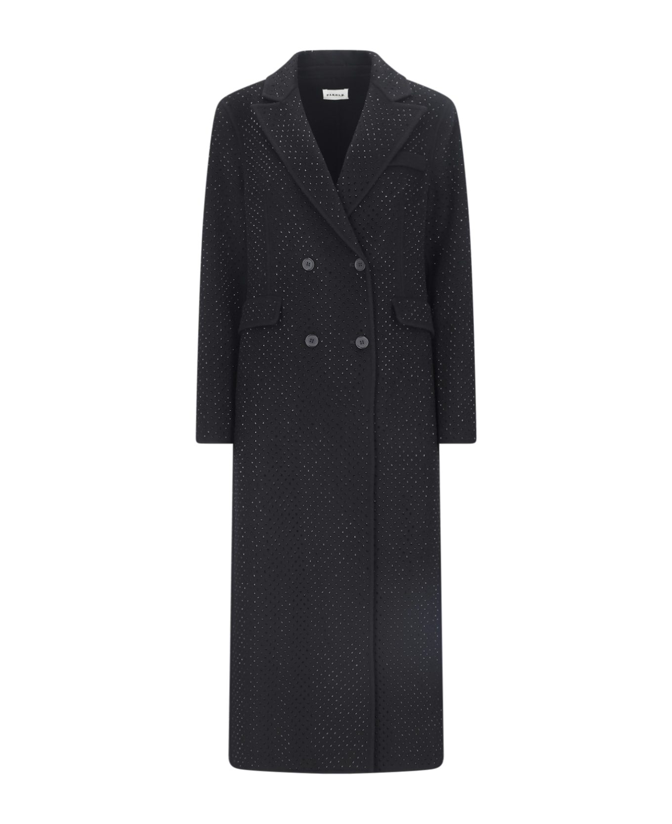 P. A. R. O. S. H. double-breasted maxi coat in black wool knit with all-over tone-on-tone rhinestone appliqués, peak lapels, button closure, buttons on the cuffs, chest pocket, two front pleats, two side flap pockets, deep central split at the back, straight hem.