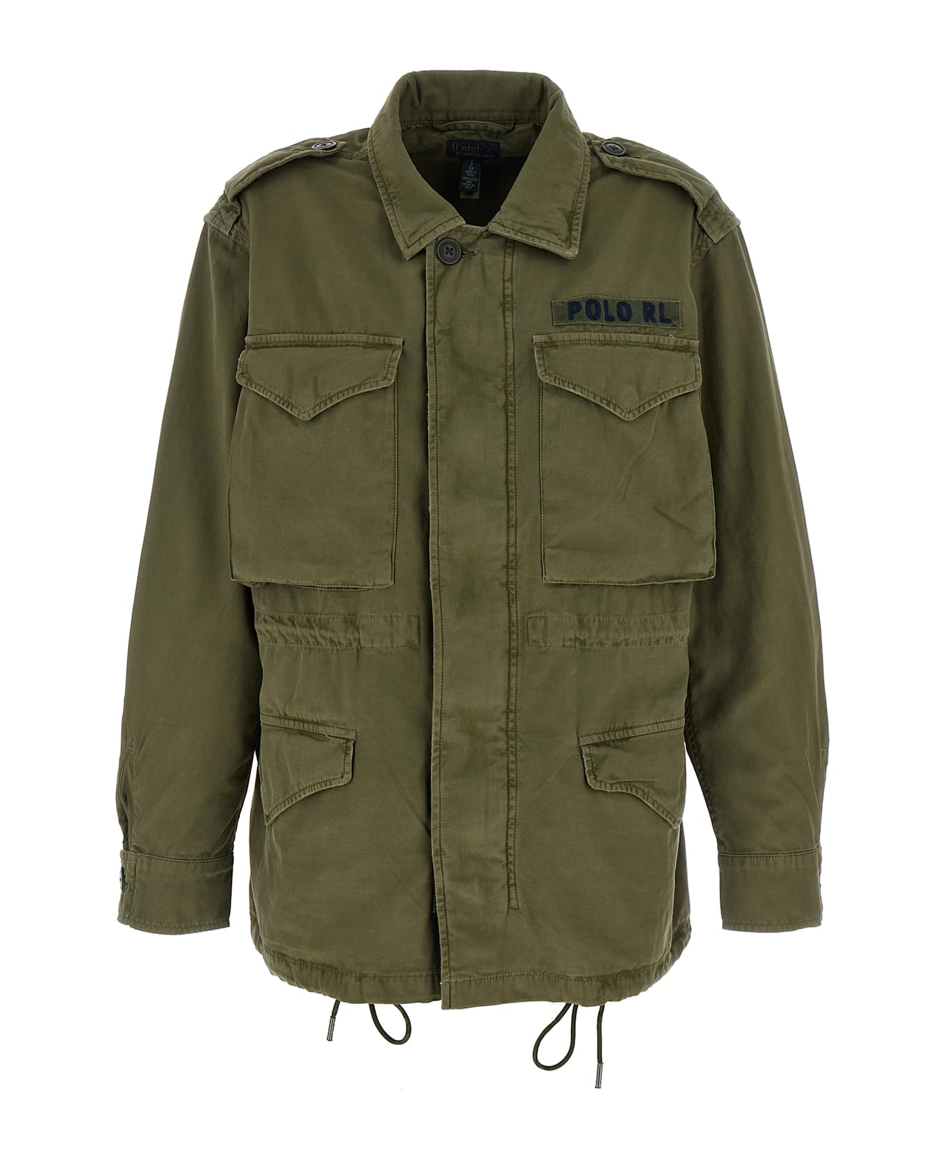 Cotton twill jacket, military model with badges on the shoulders, front logo patch, unlined, zip and button closure, pockets, long sleeves with cuffs, adjustable drawstring at the waist and on the hem.