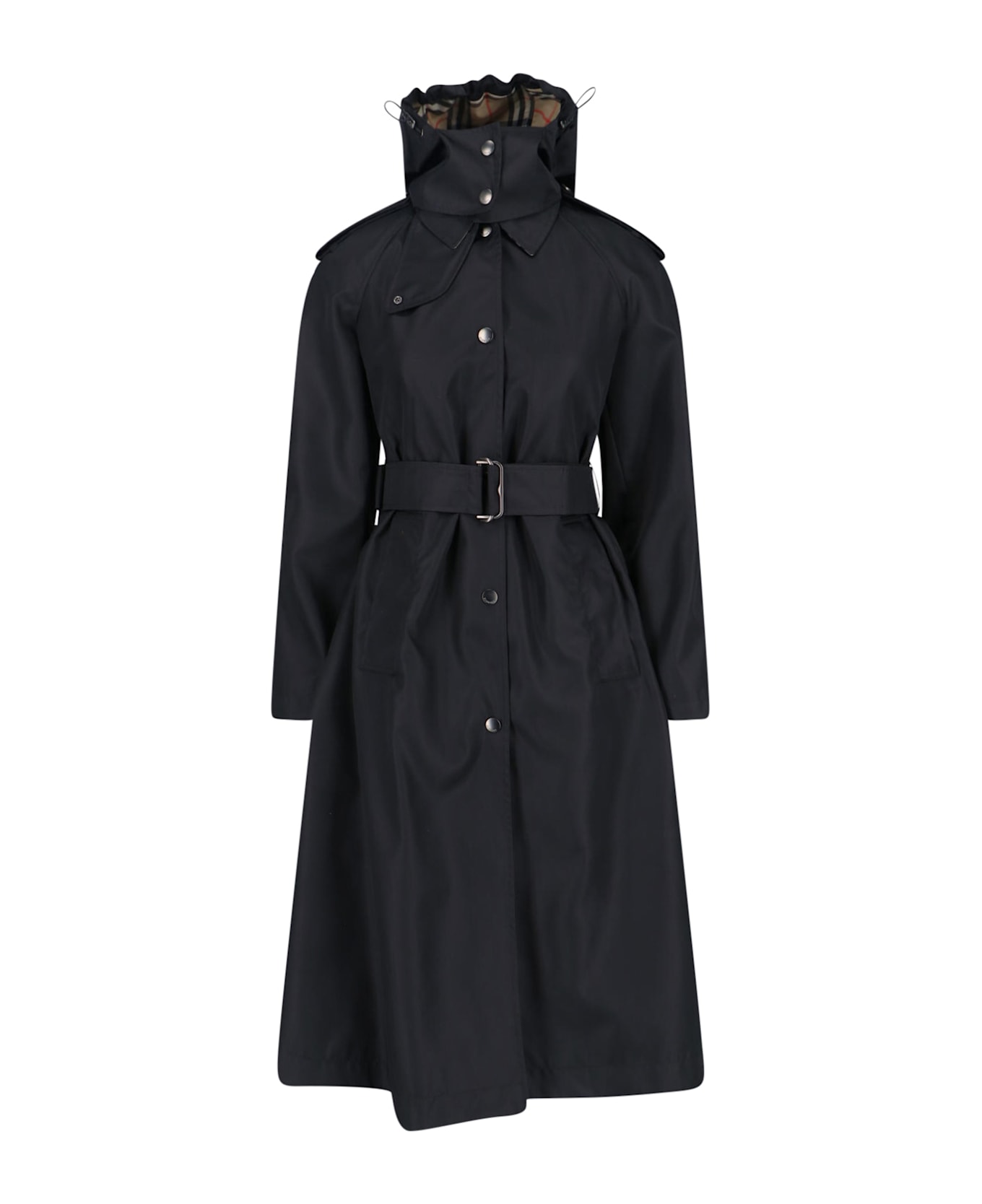 Burberry 'Car Coat' technical coat in black waterproof fabric with removable drawstring hood, check pattern detail, classic collar, button closure, adjustable and removable waist belt, two side pockets, back button closure detail, adjustable button cuffs, straight hem.