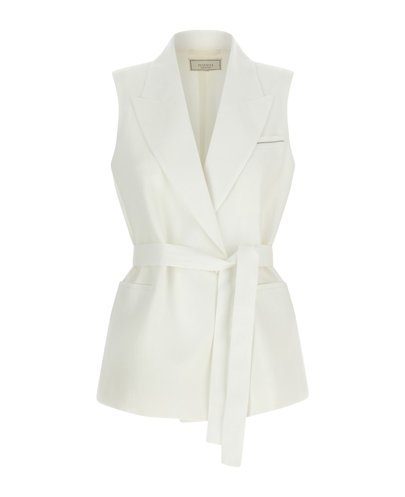 Linen vest, double-breasted style with front button closure, peak lapels, pocket with metal 'Punto Luce' detail, patch pockets, viscose lining, removable belt. Composition: 100% linen