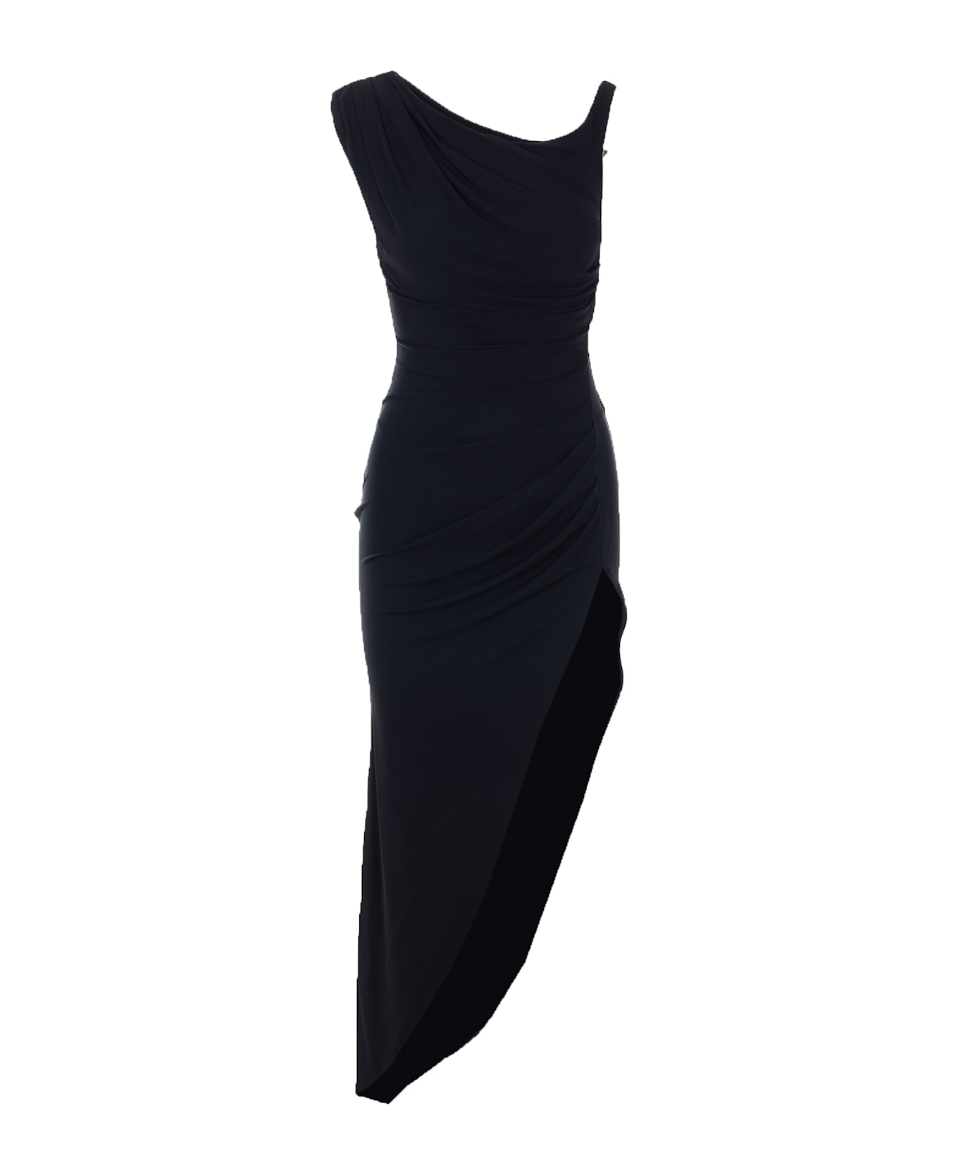 Elisabetta Franchi black long dress, lateral zip closure, reinforced shoulder and plaque detail, rouches details, elasticized and tight fit, asymmetrical at bottom Composition: 95% Viscose, 5% Elastane, 77% Polyamide, 23% Elastane