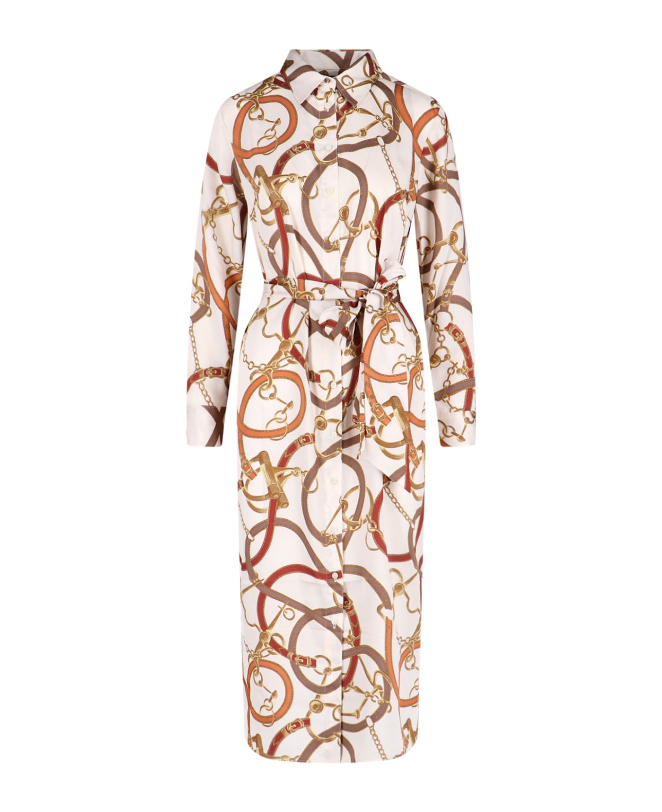 Lauren Ralph Lauren chemisier dress in cream recycled fabric with equestrian print, classic collar, button closure, long sleeves, adjustable belt at the waist, button cuffs, curved hem.