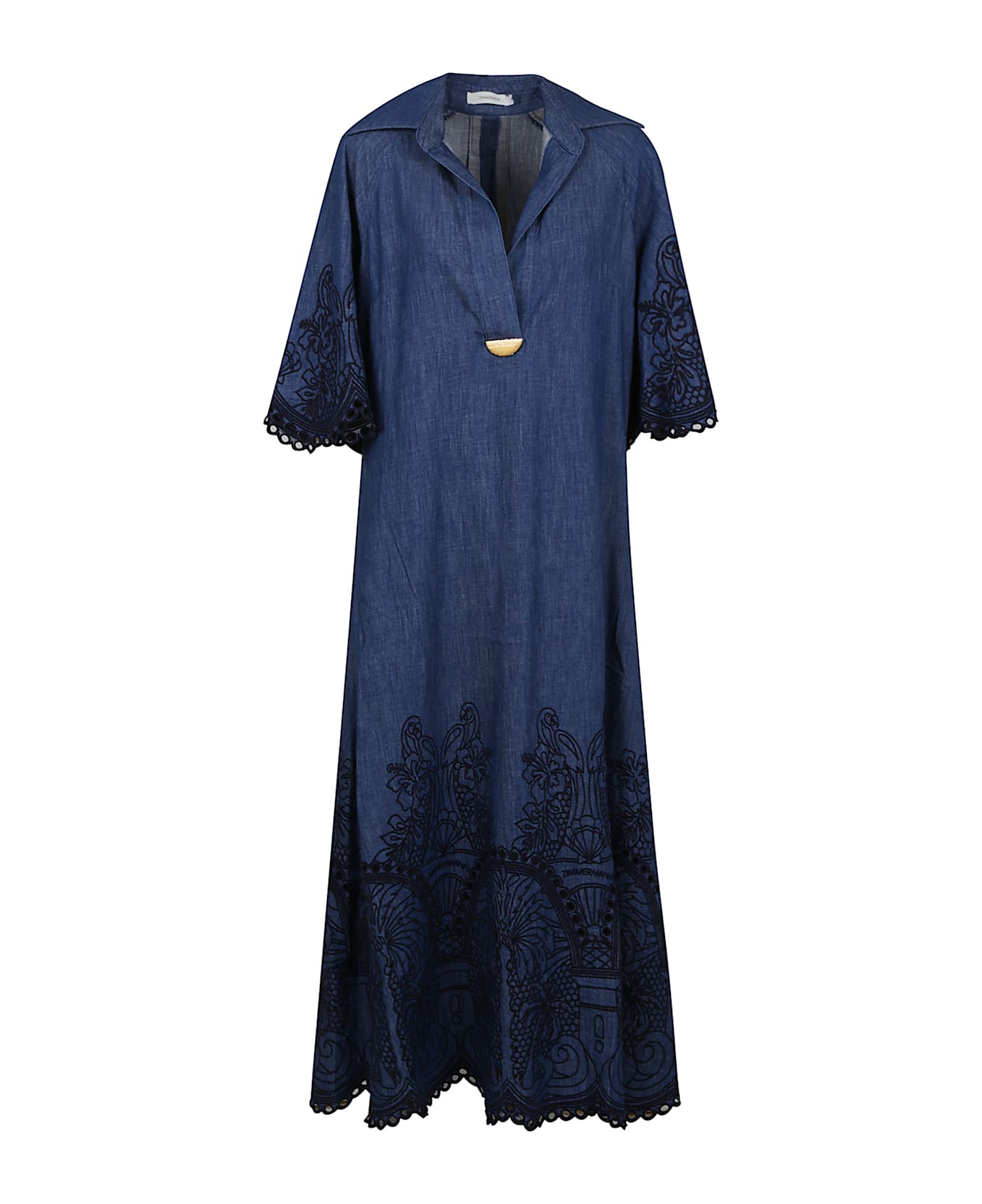 Light denim dress, ankle length embroidery on the bottom and sleeve, open shirt neckline