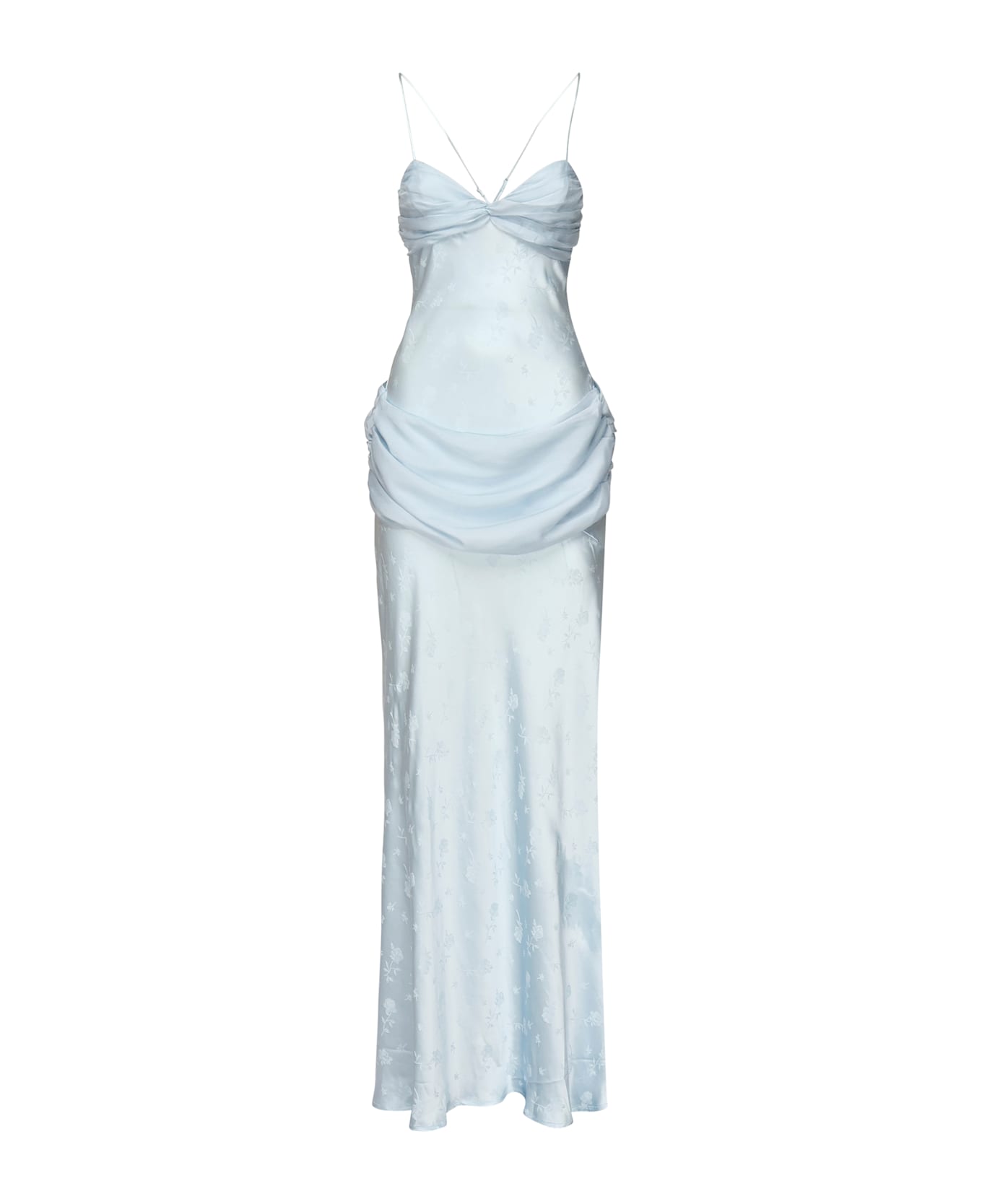-Deep back with removable bow -Unlined -Silk with jacquard print -Adjustable shoulder straps -Size shown in photo is XS -Color: Turquoise