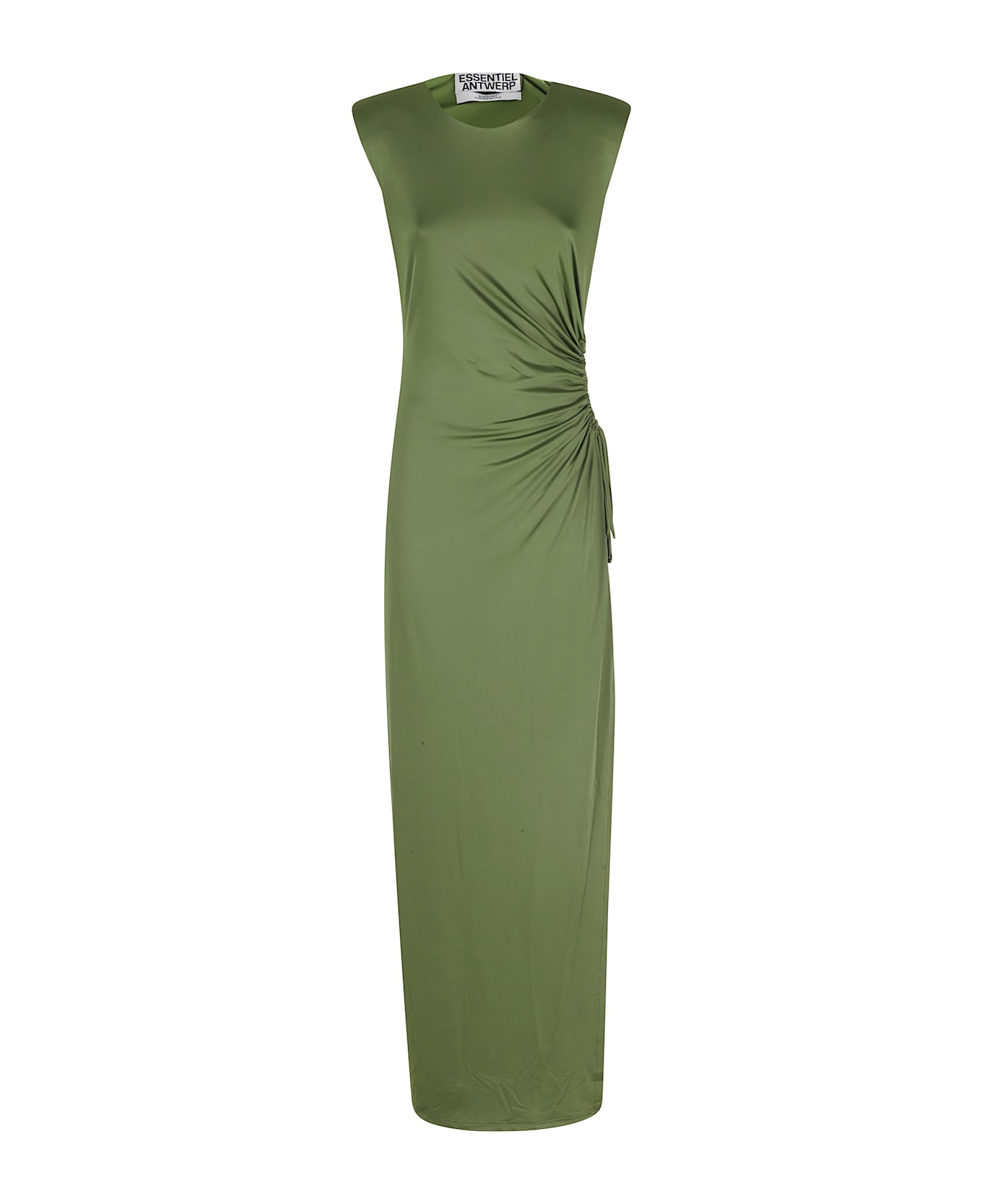 Category: Dress Item: Long Joye Dress Brand: Essentiel Antwerp Color: Green Neckline: Crew neck with padded shoulder straps Details: Side cut-out with drawstring, Side slit SIZE AND FIT Fit: Fitted Skirt: Straight