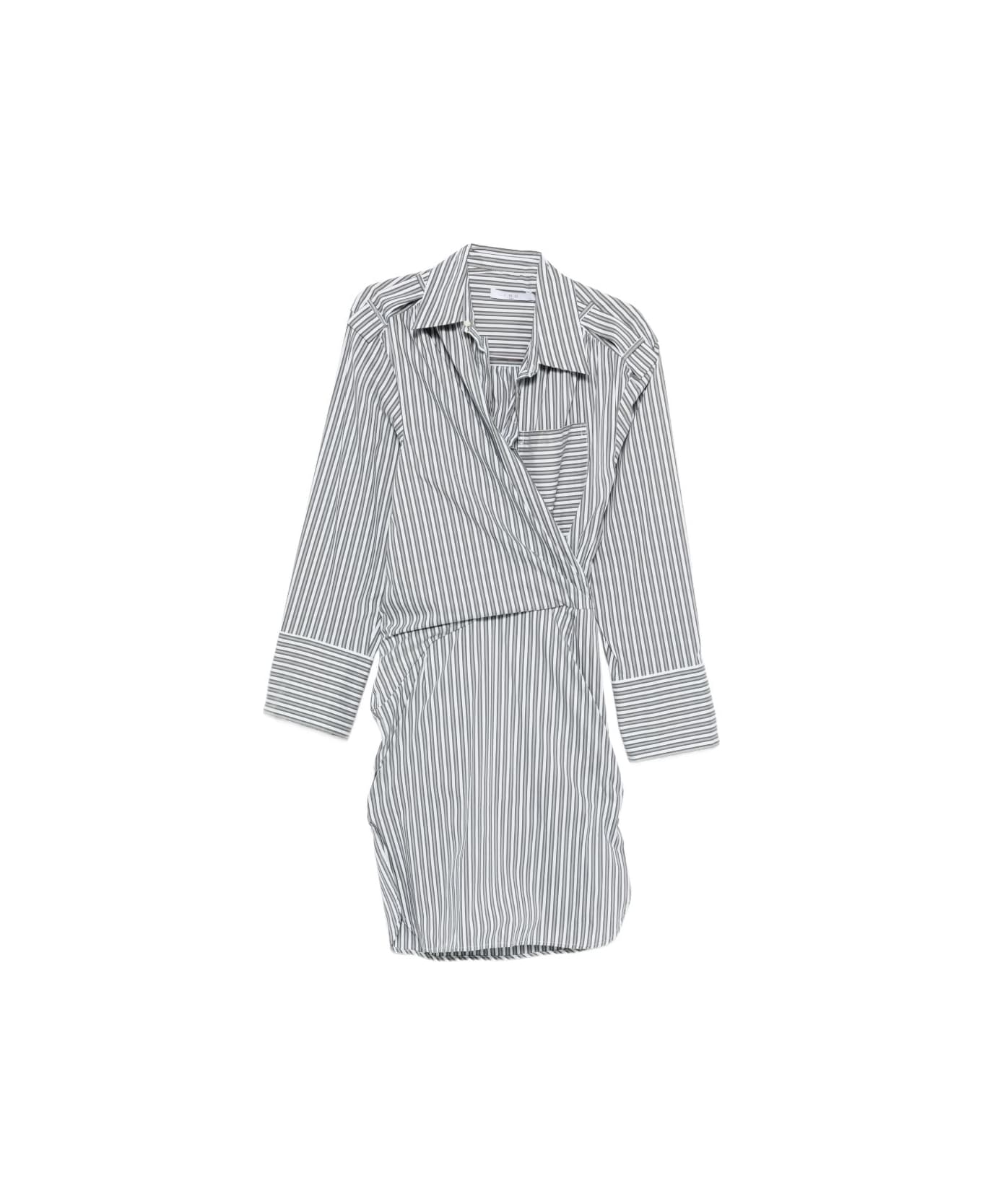 blue/grey/white stripe pattern straight-point collar chest patch pocket long sleeves wrap design