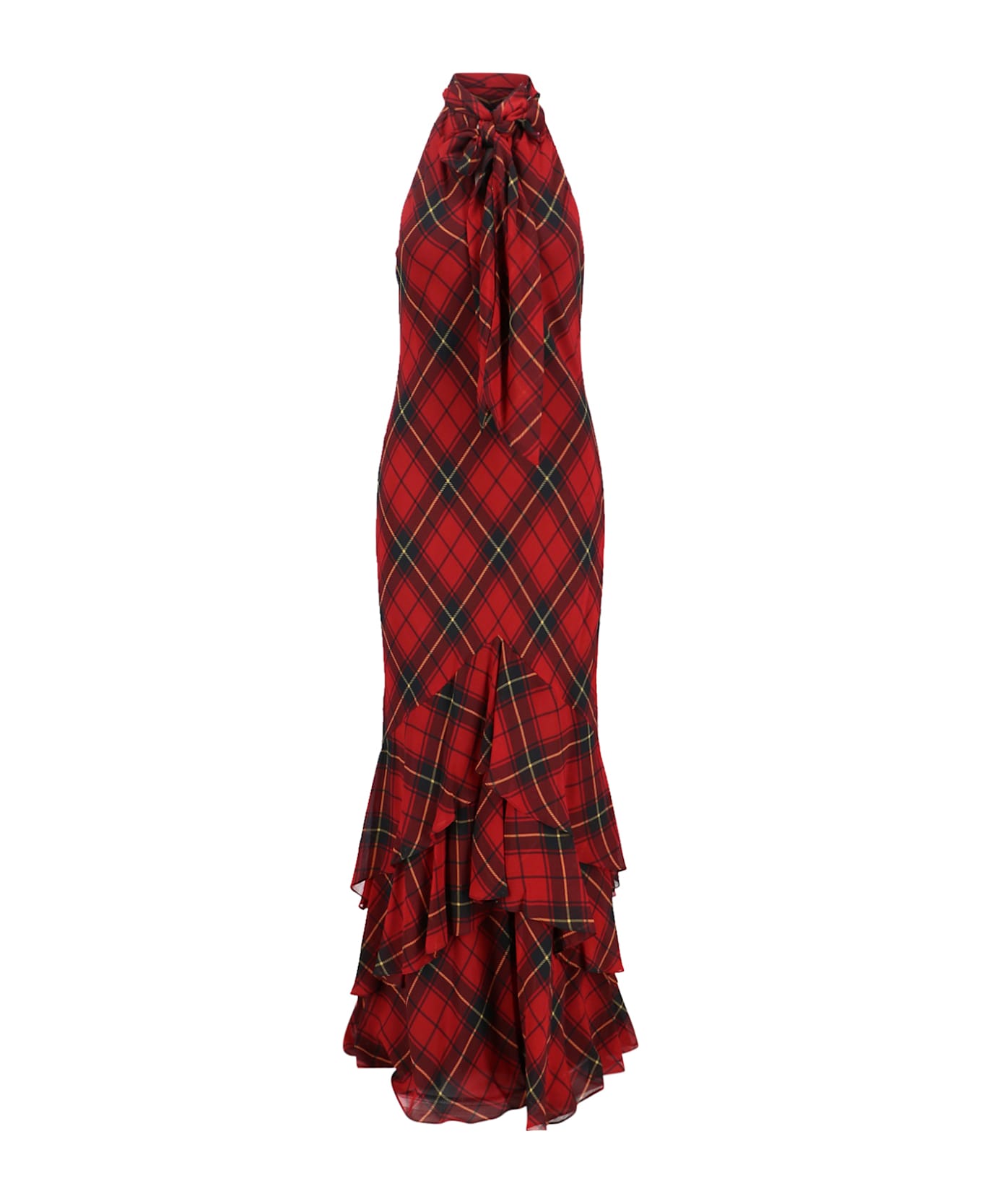 Lauren Ralph Lauren maxi dress in red fabric with check pattern, halterneck, neck knot detail, flounced skirt, and asymmetrical hem. Composition: 100% Polyester