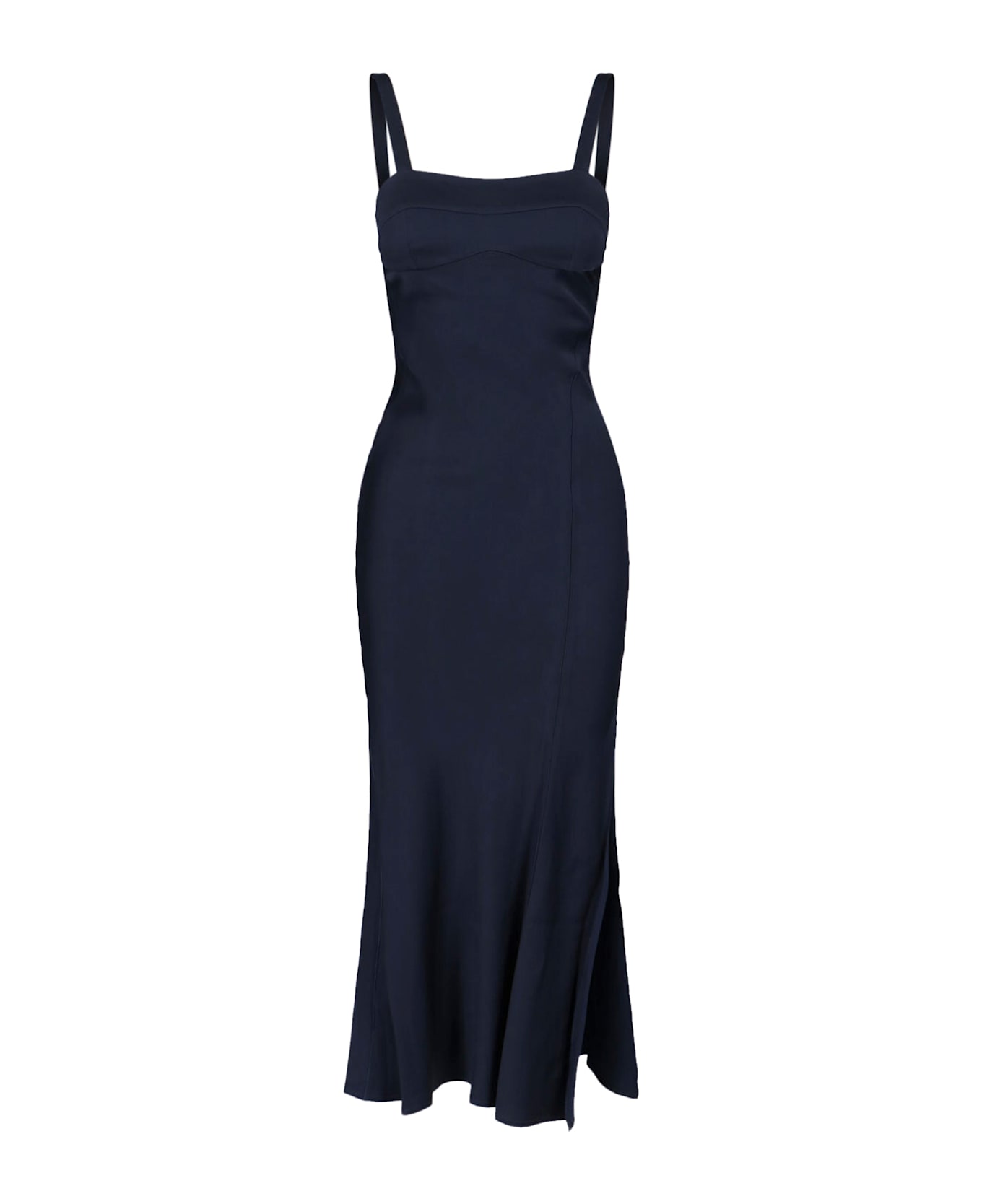 Victoria Beckham navy satin midi dress with shoulder straps, side zip closure, straight hem. Composition: 71% Acetate, 29% Viscose