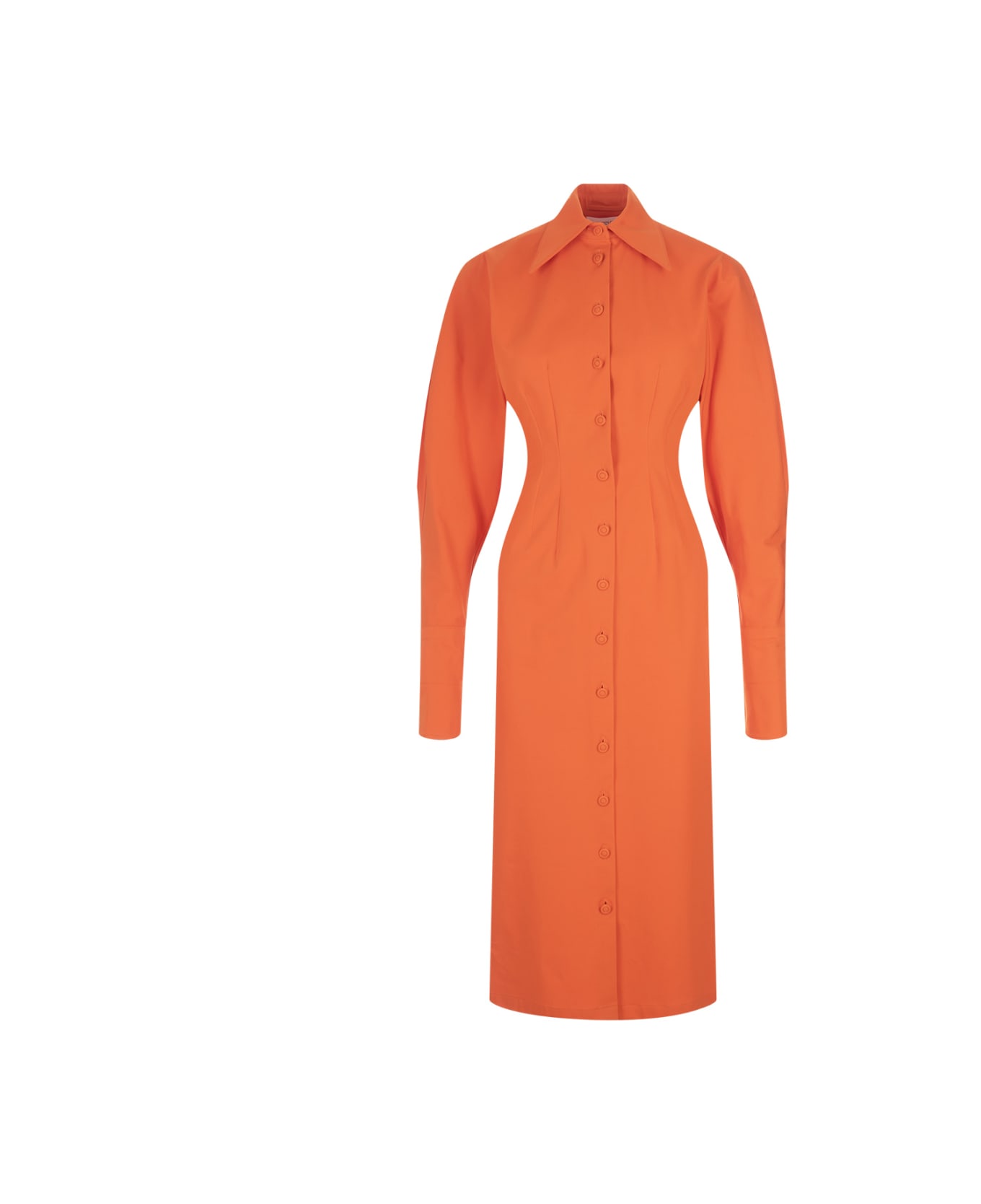 Orange Enigma shirt dress by Sportmax made of stretch cotton gabardine, with a sheath line. The kimono-cut sleeves have a wide volume that narrows towards the wrist. Double darts in front and back make the garment more feminine and fitted. Customised buttons covered in on tone fabric. Double-height cuffs that can also be worn folded over.