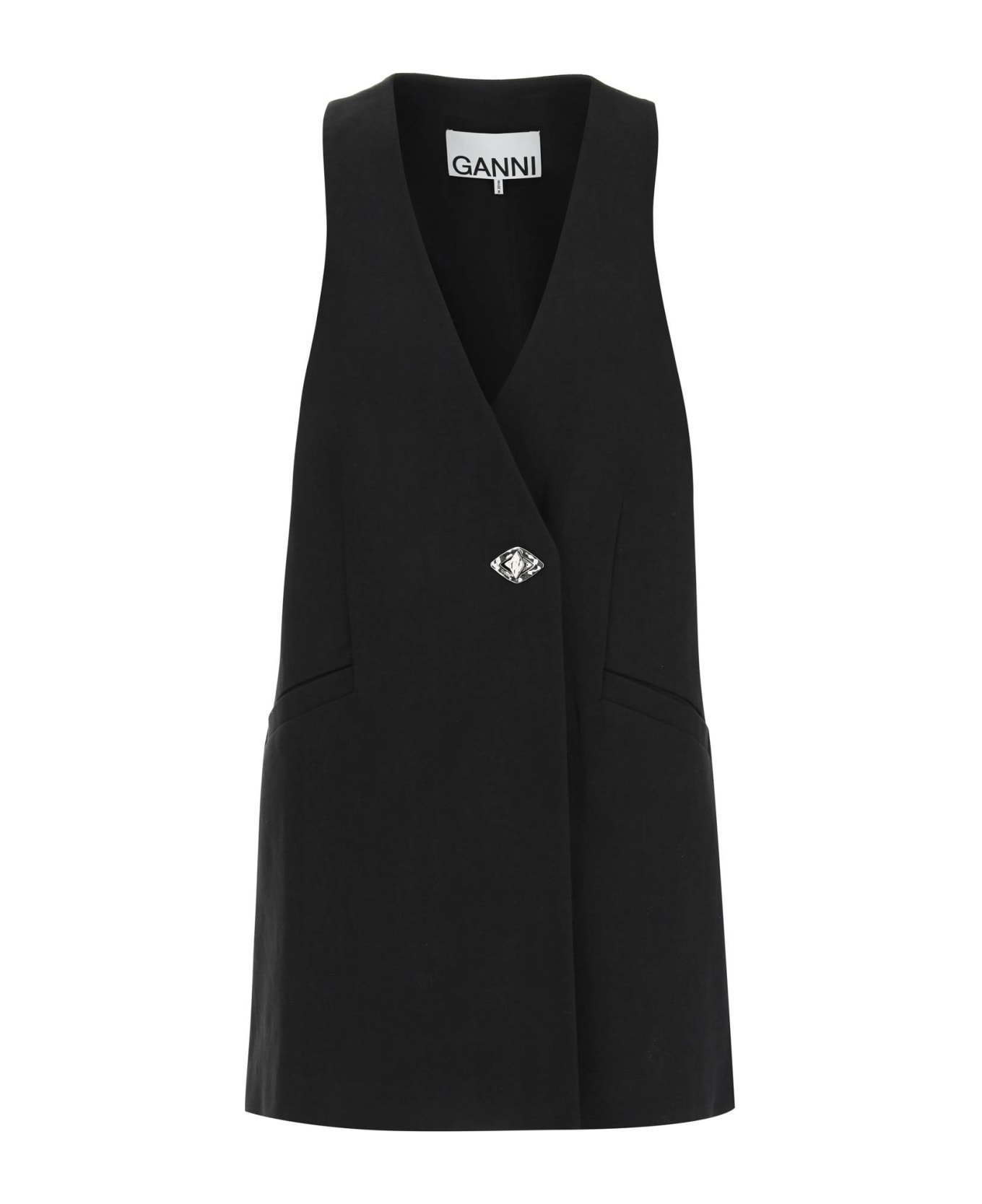 Ganni mini dress enhanced by a double-breasted vest design. Crafted in organic cotton suiting with a deep V-neckline and racer back, it features a turn-lock fastening and slanted welt pockets. Branded lining. The model is 177 cm tall and wears a size EU 34. Composition: 100% CO