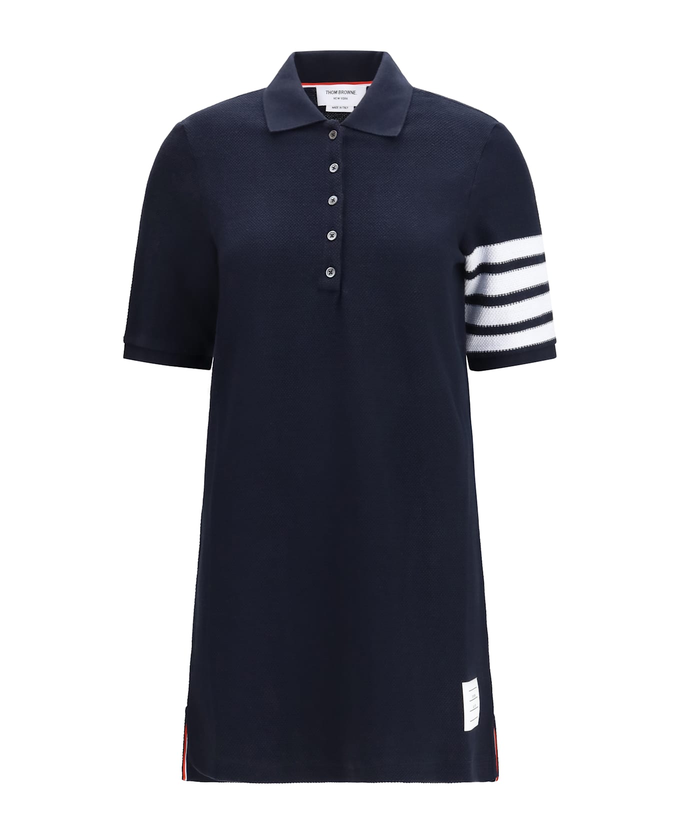 The piqué polo dress by thom browne is an elegant and sporty garment, featuring a collar and button closure with short sleeves for a comfortable fit. the iconic stripes on the left sleeve and the logo patch on the front add distinctive details, making the dress perfect for refined casual looks.
