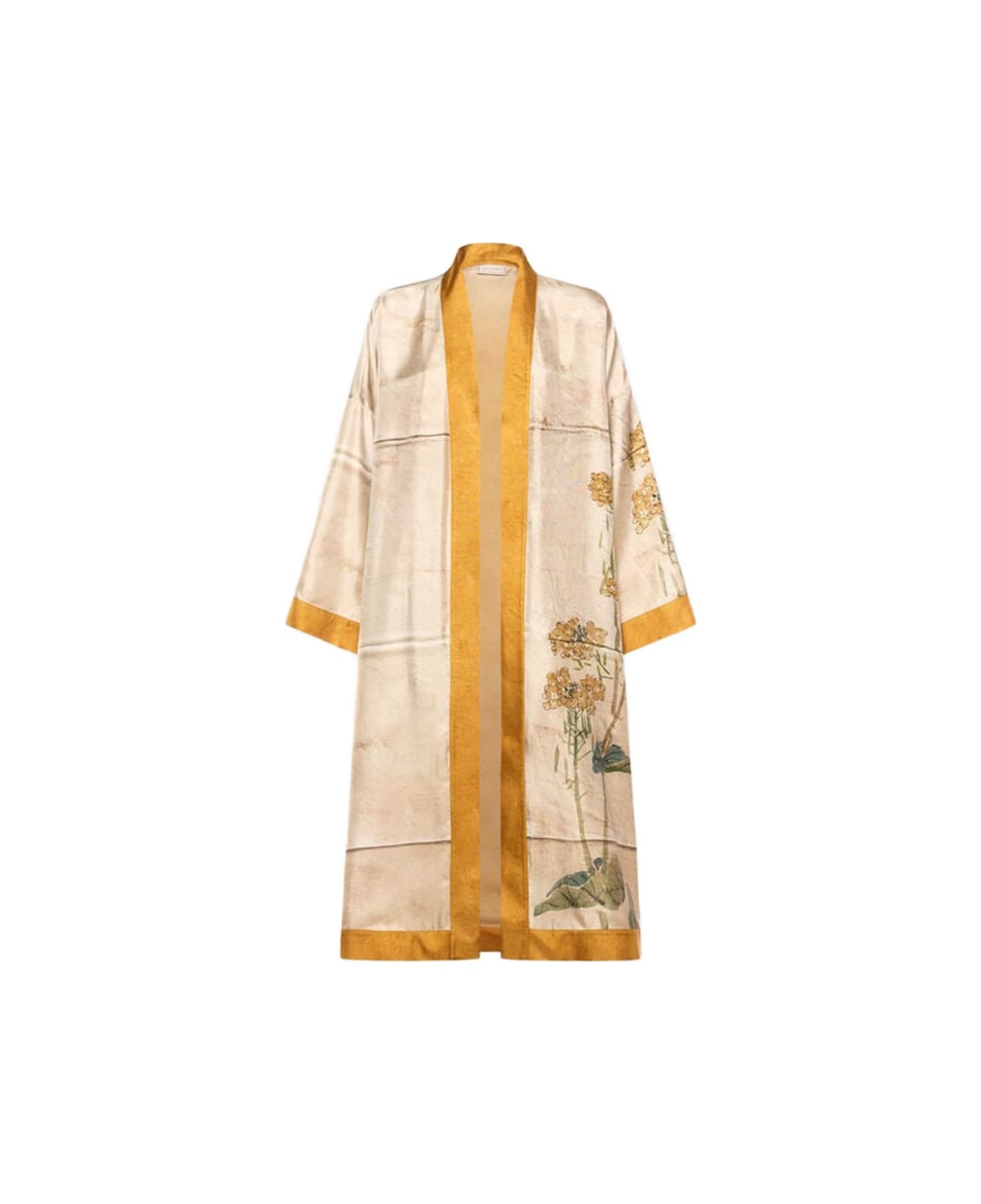 beige floral print open front long sleeves silk