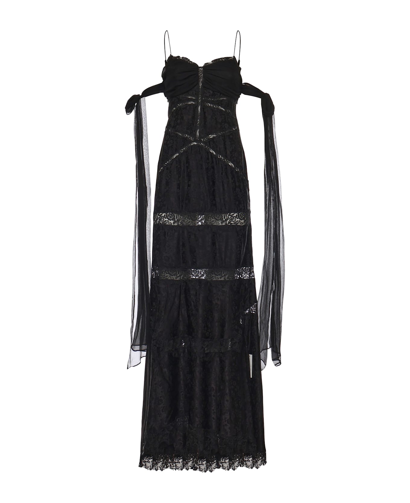 - Made of silk jacquard with lace inserts - Adjustable shoulder straps - Mermaid skirt - Size shown is XS - Color: Black