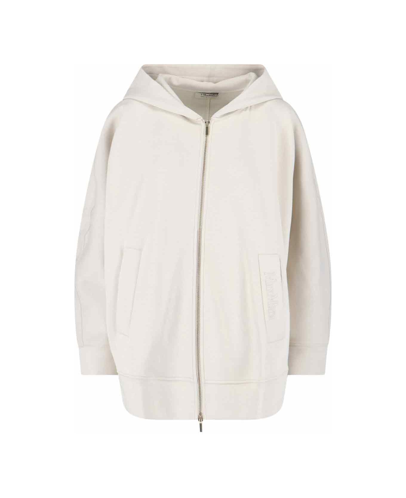 Max Mara's 'Verbano' zip sweatshirt in cream cotton blend with hood, double zip closure, two side pockets, logo embroidery detail, ribbed trims, straight hem. Composition: 78% Cotton, 22% Polyester