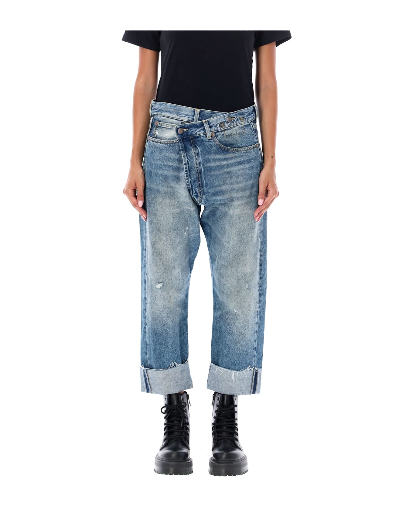 Cross Over Jeans By R13. Featuring: Denim Fabric Relaxed Fit Unique Crossover Waistband Button Front Closure Classic Five-pocket Style Belt Loops Distressed Wash Model Is 1,72 M And Wears Size 26