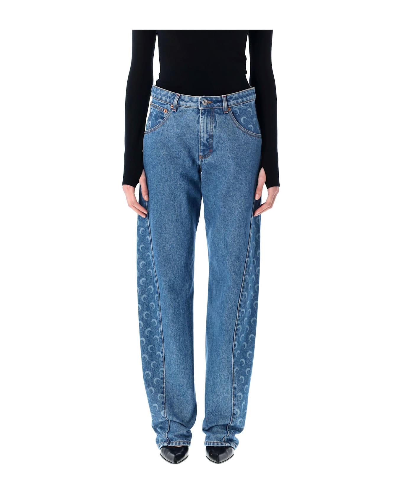 Moon Laser Denim Curved Jeans By Marine Serre. Featuring: Medium-waisted Button And Zip Fly Belt Loops Five Pockets Curved Yoke On Inside Seam Embroidery On Back Pocket Branded Jacron Woven On Back Waistband Signature Moon Laser Printed All Over On Side Yokes And Back Panel Relaxed Fit Model Is 1,70 M And Wears Size 36