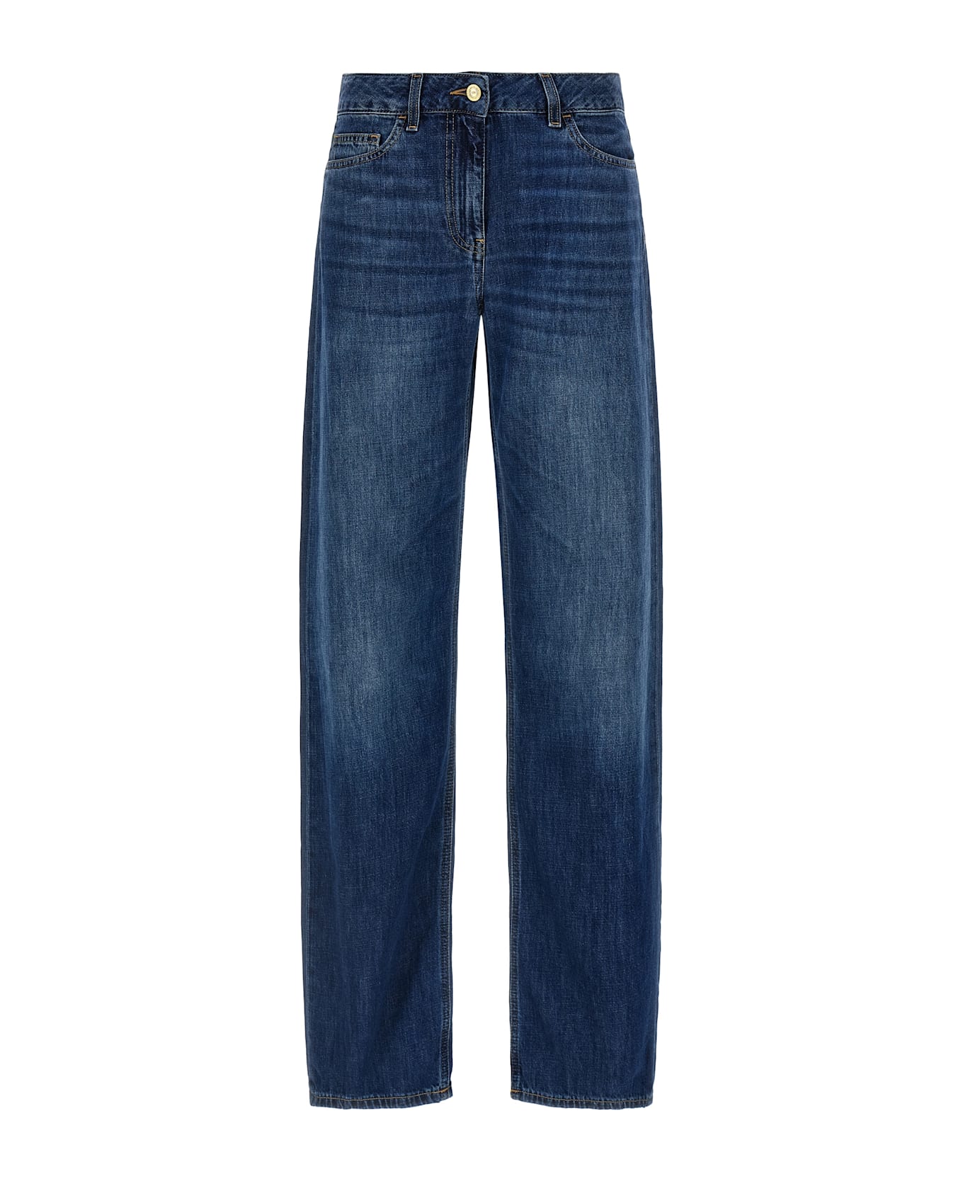 Stonewashed cotton denim jeans with low waist, wide palace leg, back logo embroidery, front zip and button closure, five pockets. Composition: 100% cotton