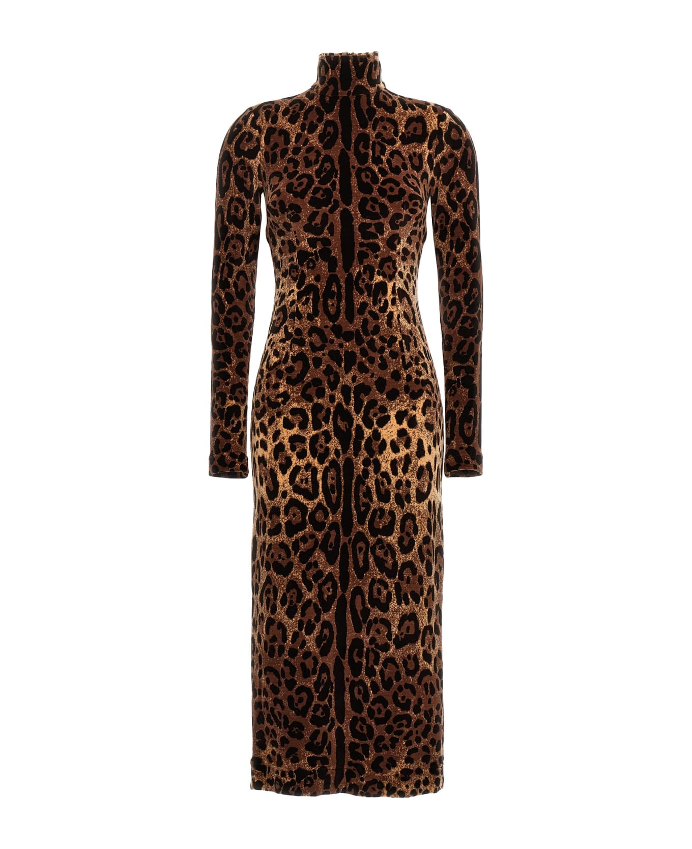 Midi dress in cotton velvet with all-over animal print, slim model with long sleeves and high neck. Composition: 85% cotton, 15% polyamide