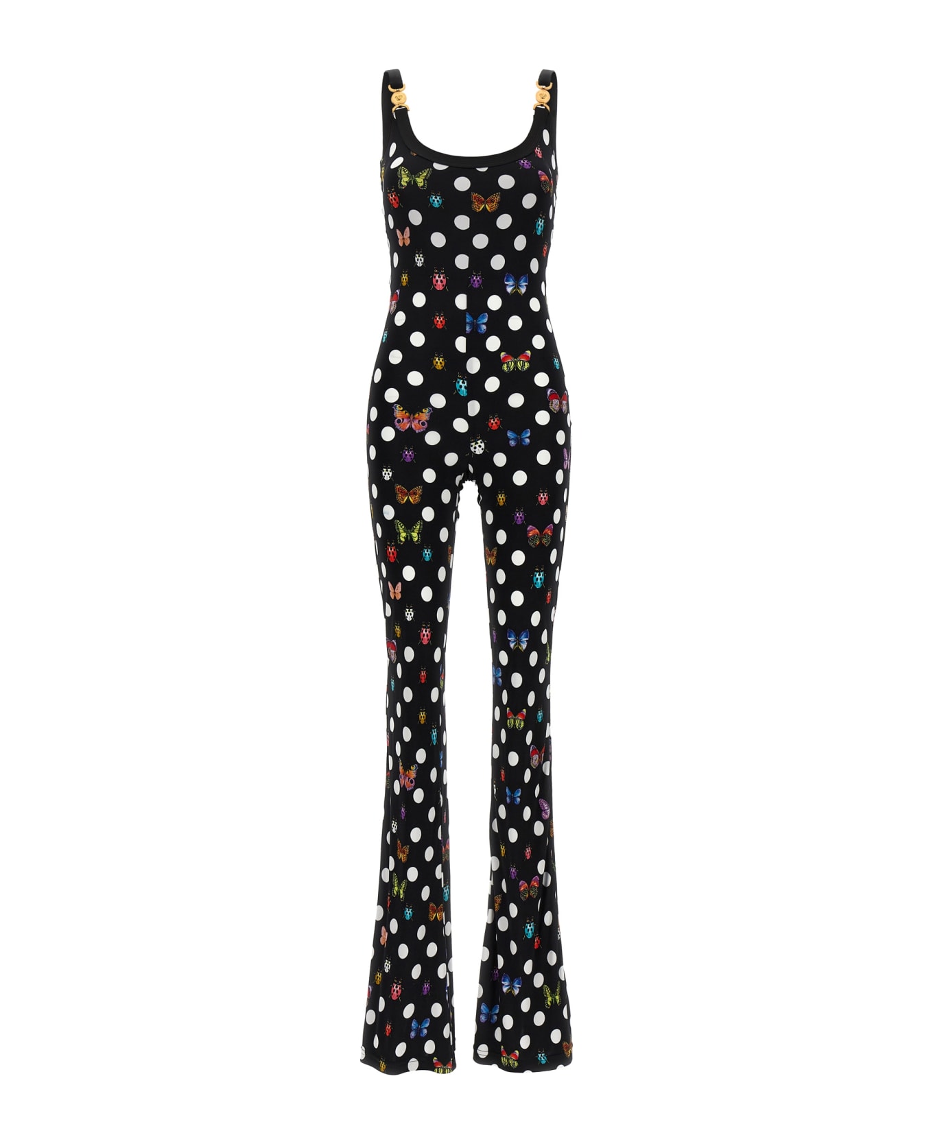 La Vacanza capsule jumpsuit in viscose with all-over 'Heritage Butterflies & Ladybugs Polka Dot' print, Medusa '95 detail on shoulder straps, round neckline, and flared long leg. Composition: 100% viscose