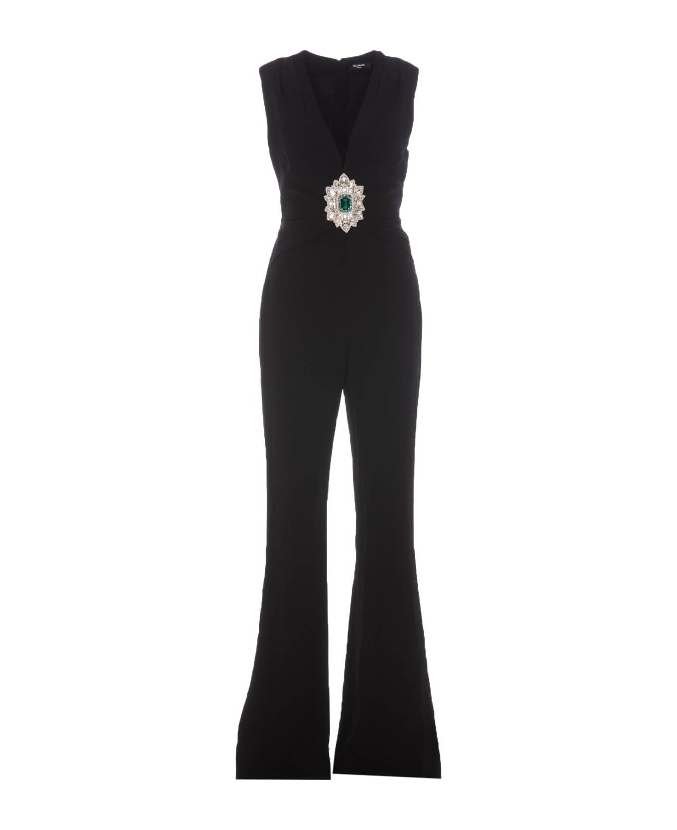 Balmain black suit, zip closure on the back, sleeveless, v-neck, frontal maxi jewelled detail Composition: 100% Viscose